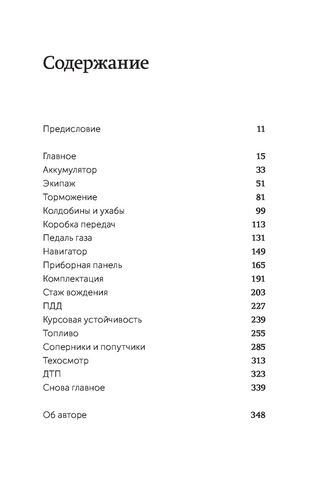 Эта книга композиционно организована, как руководство для автомобилистов, готовящихся к длинной гонке. В ней есть соответствующие разделы: «Педаль газа», «Приборная панель», «Экипаж», «Курсовая устойчивость, «Торможение» и др.