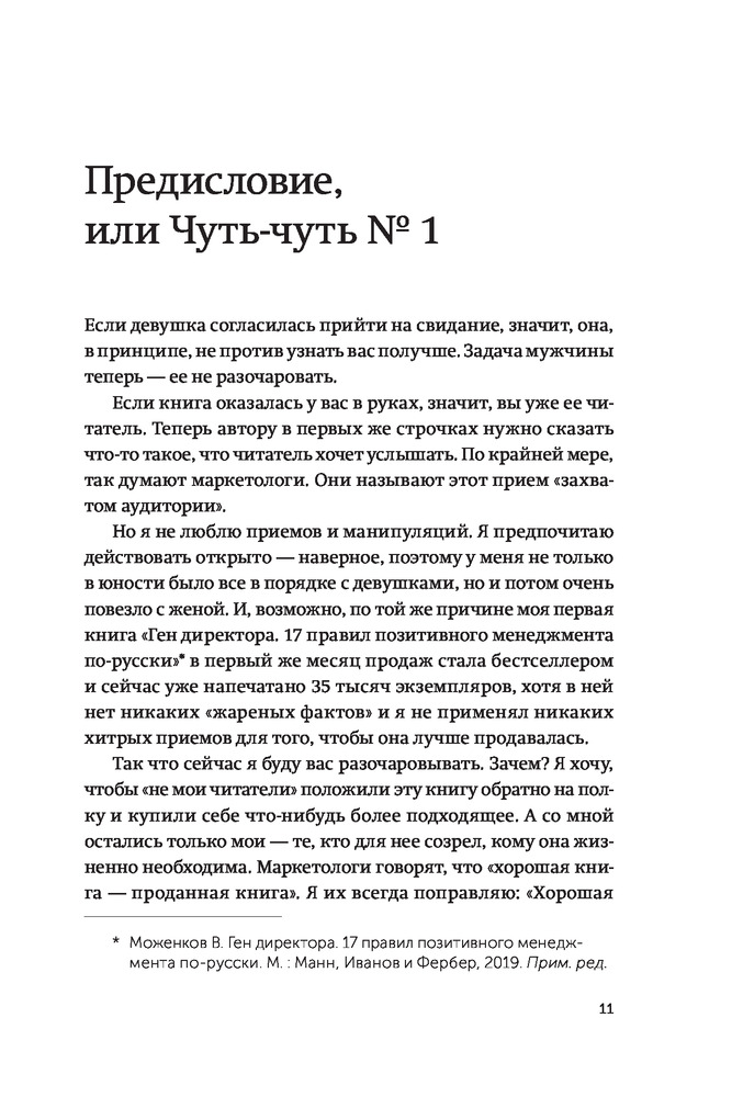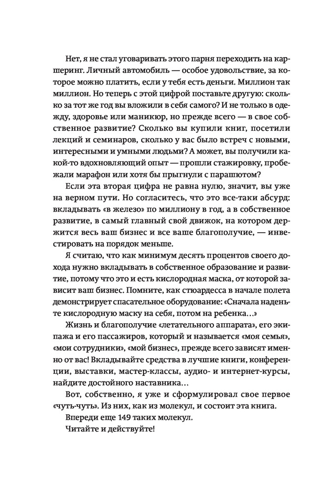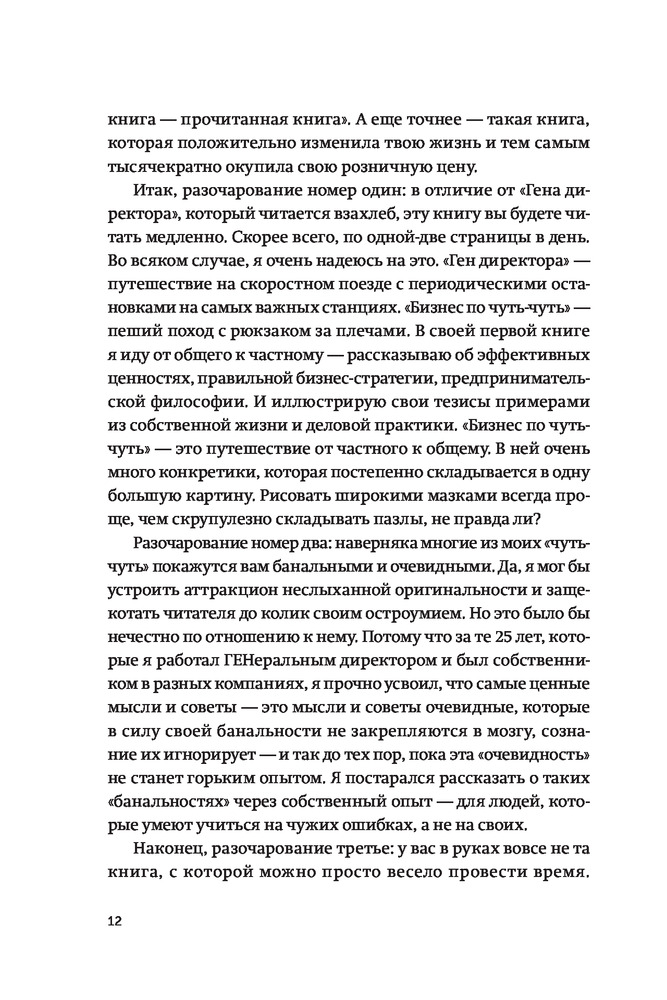 Наверняка, многие из моих «чуть-чуть» покажутся вам банальными и очевидными. Но за те 25 лет, которые я работал генеральным директором в разных компаниях, я точно усвоил, что самые ценные мысли и советы — это мысли и советы очевидные. Которые в силу своей банальности не закрепляются в мозгу, сознание их игнорирует — и так до тех пор, пока та же «очевидность» не вернется к вам уже вместе с горьким опытом. Я постарался рассказать о таких «банальностях» через опыт свой собственный. Для людей, которые умеют учиться на чужих ошибках, а не на своих.
