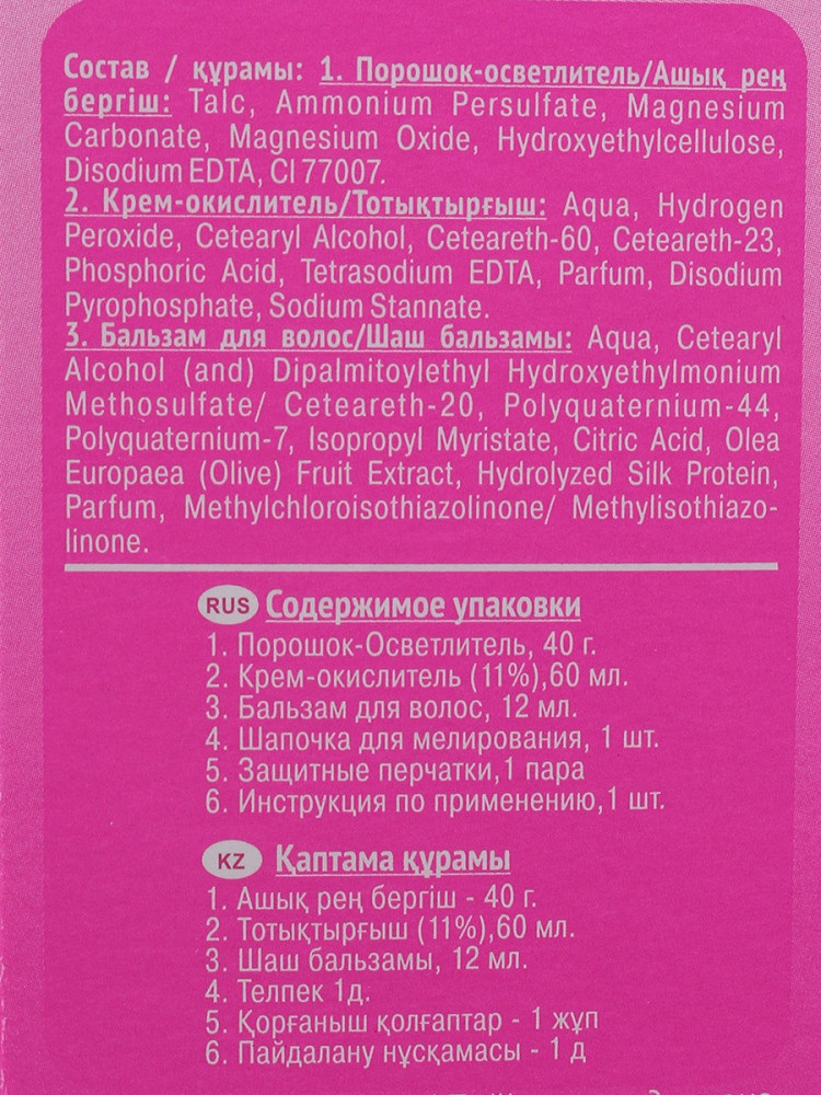 💳 Оплатить за товар можно при получении 🇰🇿 Есть бесплатная доставка по Казахстану от 1 дня 🎁 Копите бонусы с каждой покупки Средство для мелирования волос на основе белой хны Балеяж. Средство профессионального уровня для мелирования и осветления волос. Балеяж обеспечит Вам превосходное осветление на 5-7 модных тонов блонд без эффекта желтизны. Мягкая осветляющая формула нового поколения не повреждает структуру волос. Разработано специально для применения в домашних условиях. |