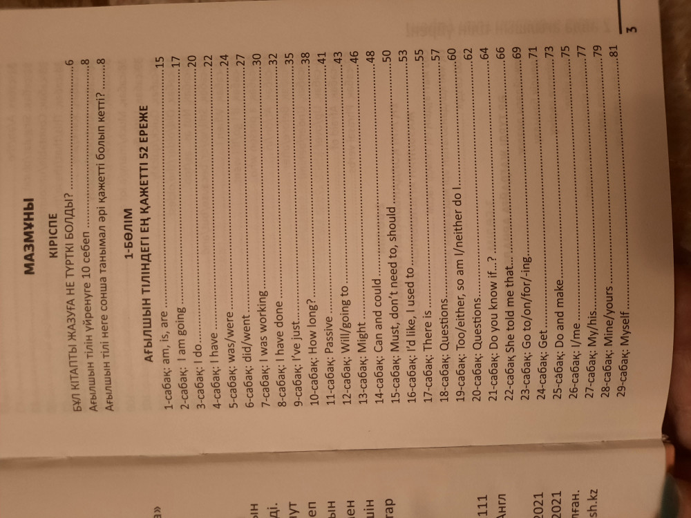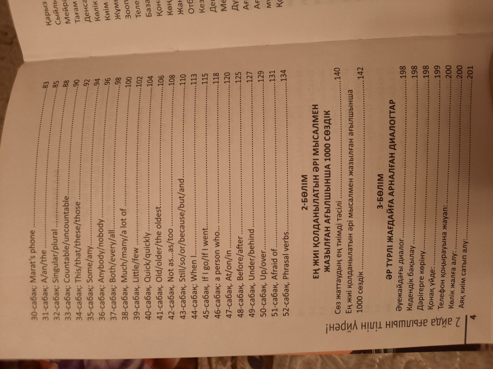 Книга понравилась последовательным раскладом базового материала. Обучение англо-казахское, 52 урока с правилами и упражнениями, тематический словарь, и тематические диалоги на все случаи жизни. Советую всем, кто разговаривает и мыслит на казахском зыке для повторения своих базовых знаний и восполнения пробелов знаний по английскому языку.