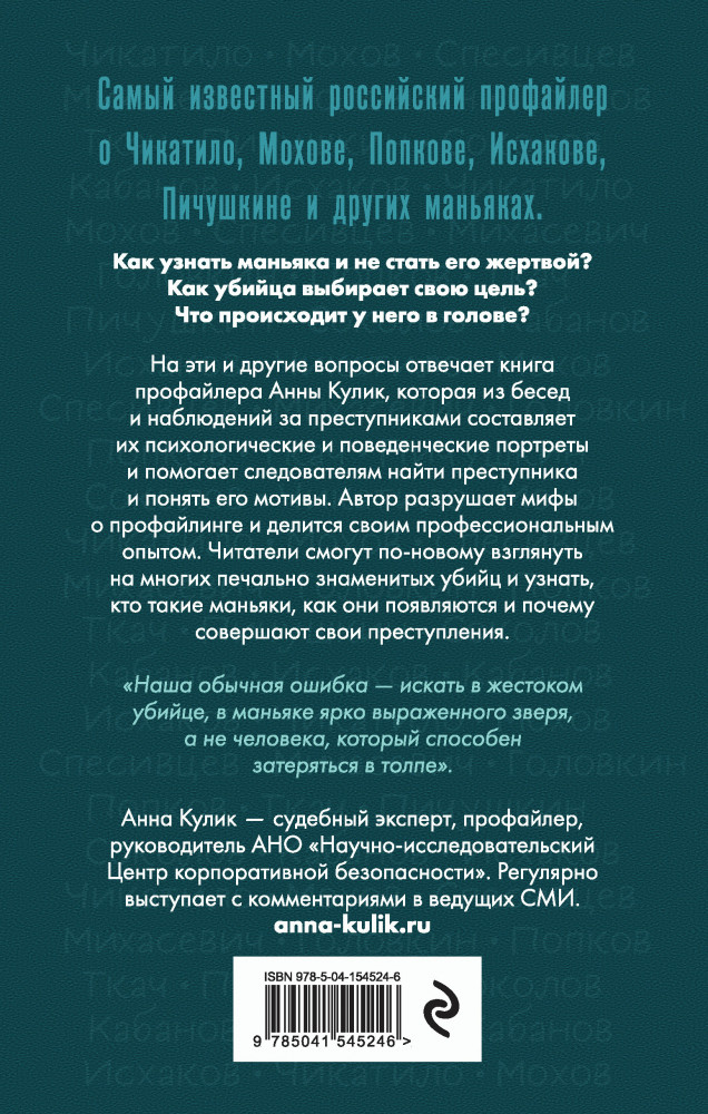 Портрет психопата. Профайлер о серийных убийцахВ данный момент этот товар отсутствует в продаже. Возможно, у нас найдется аналогичный или похожий товар здесь. Серия: Портрет психопата. Профайлер о серийных убийцах О профайлинге широкая аудитория узнала относительно недавно, и с легкой руки писателей и кинематографистов сегодня с ним связано множество мифов, домыслов и небылиц. Книга профессионального профайлера Анны Кулик позволяет заглянуть в этот будоражащий нервы и воображение мир. Она рассказывает об истории профайлинга и о том, как его методики применяются в современных условиях, в том числе в сфере бизнеса, позволяет узнать, чем отличаются психопаты от социопатов и какие факторы влияют на формирование серийного убийцы. |
