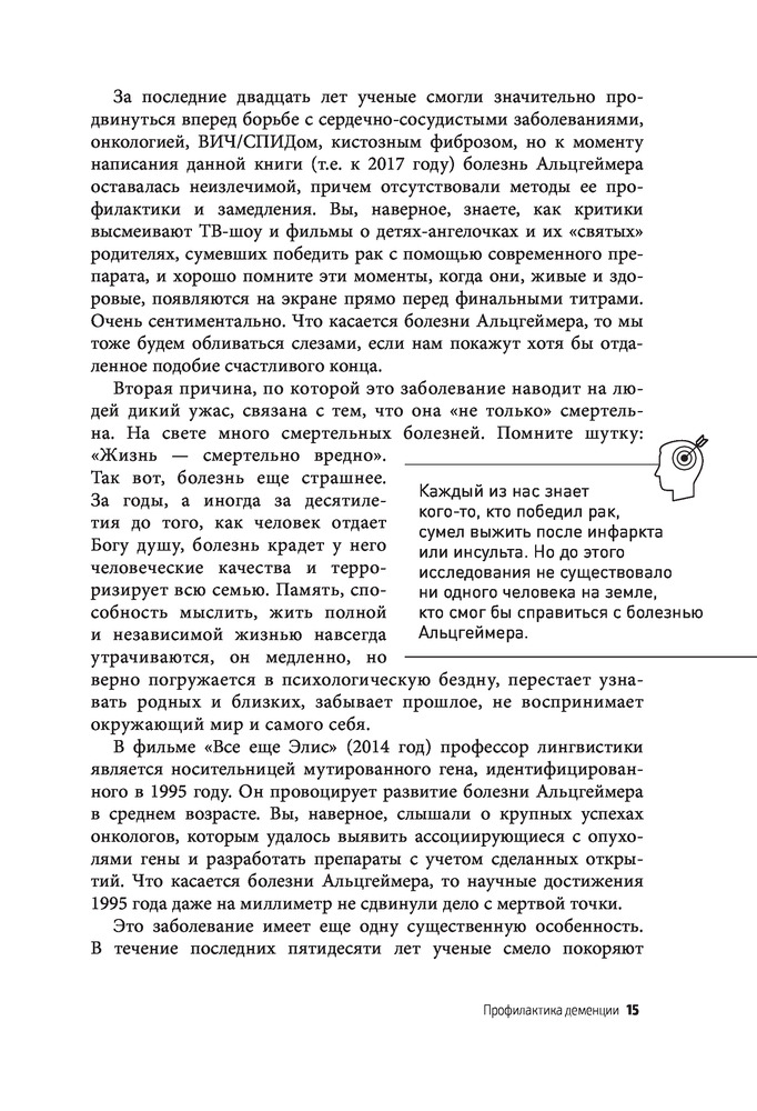 В данный момент этот товар отсутствует в продаже. Возможно, у нас найдется аналогичный или похожий товар здесь. Серия: Открытия века: новейшие исследования человеческого организма во благо здоровья Болезнь Альцгеймера — неизлечимое заболевание. Все современные медикаментозные методы лечения направлены лишь на торможение снижения когнитивных способностей. Генетика не добавляет оптимизма — наличие в геноме гена APOE4 гарантированно приводит к развитию болезни в 60—70-летнем возрасте. НО!