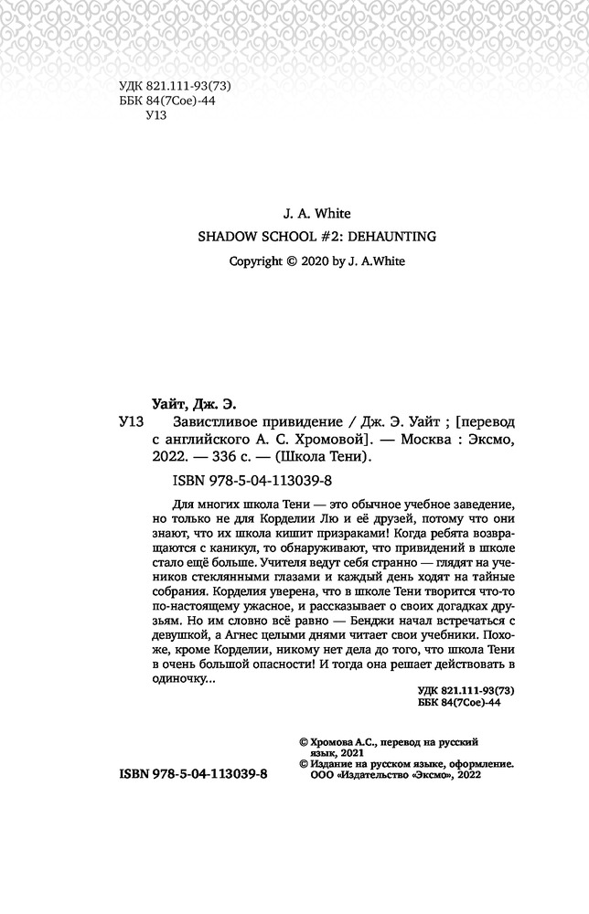 Завистливое привидениеВ данный момент этот товар отсутствует в продаже. Возможно, у нас найдется аналогичный или похожий товар здесь. Серия: Детск. Школа Тени Для многих школа Тени — это обычное учебное заведение, но только не для Корделии Лю и её друзей, потому что они знают, что их школа кишит призраками! Когда ребята возвращаются с каникул, то обнаруживают, что привидений в школе стало ещё больше. Учителя ведут себя странно — глядят на учеников стеклянными глазами и каждый день ходят на тайные собрания. Корделия уверена, что в школе Тени творится что-то по-настоящему ужасное и рассказывает о своих догадках друзьям. Но им словно всё равно — Бенджи начал встречать с девушкой, а Агнес целыми днями читает свои учебники. Похоже, кроме Корделии никому нет дела до того, что школа Тени в очень большой опасности! И тогда она решает действовать в одиночку... |