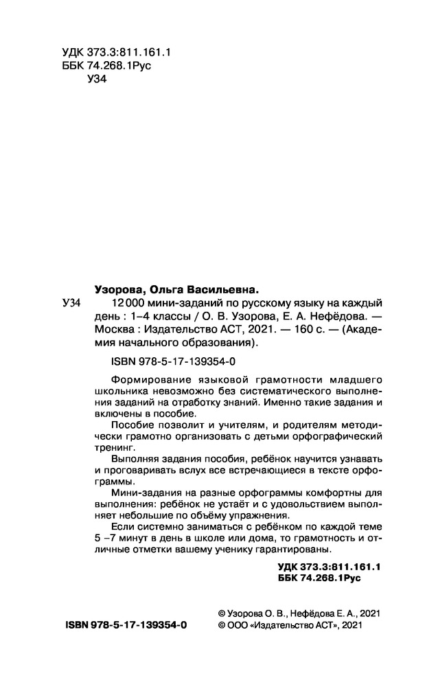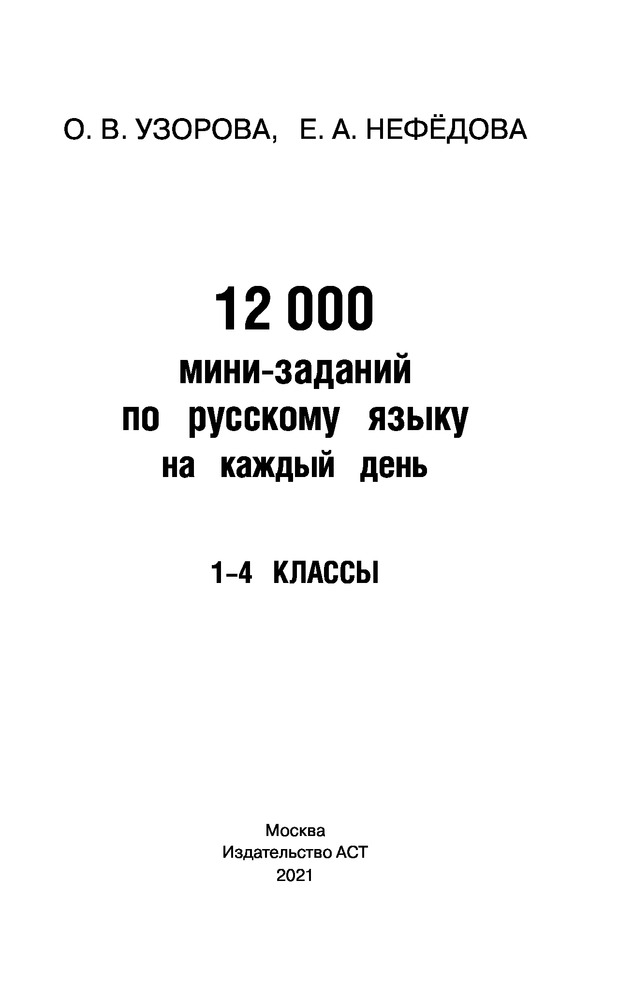12000 мини-заданий по русскому языку на каждый день. 1-4 классы.Ольга Васильевна Узорова, Елена Алексеевна Нефедова В данный момент этот товар отсутствует в продаже. Возможно, у нас найдется аналогичный или похожий товар здесь. Серия: Академия начального образования Ни для кого не секрет, что зачастую наши ученики учат правила, но пишут безграмотно, потому что не умеют применять их на практике. Формирование языковой грамотности младшего школьника невозможно без систематического выполнения заданий на отработку знаний. Именно такие задания и включены в пособие. |