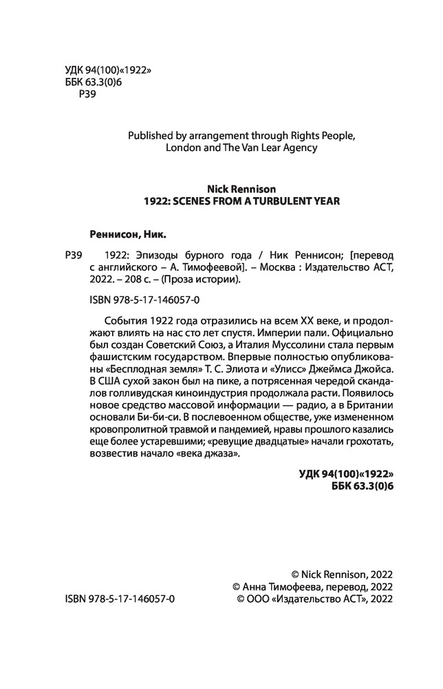 💳 Оплатить за товар можно при получении 🇰🇿 Есть бесплатная доставка по Казахстану от 1 дня 🎁 Копите бонусы с каждой покупки Серия: Проза истории События 1922 года отразились на всем ХХ веке, и продолжают влиять на нас сто лет спустя. Империи пали. Официально был создан Советский Союз, а Италия Муссолини стала первым фашистским государством. Впервые полностью опубликованы «Бесплодная земля» Т. С. Элиота и «Улисс» Джеймса Джойса. В США сухой закон был на пике, а потрясенная чередой скандалов голливудская киноиндустрия продолжала расти. Появилось новое средство массовой информации — радио, а в Британии основали Би-би-си. В послевоенном обществе, уже измененном кровопролитной травмой и пандемией, нравы прошлого казались еще более устаревшими; «ревущие двадцатые» начали грохотать, возвестив начало «века джаза». |