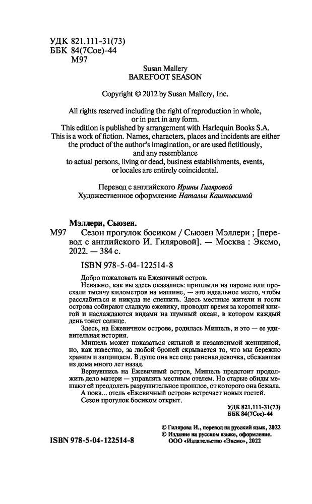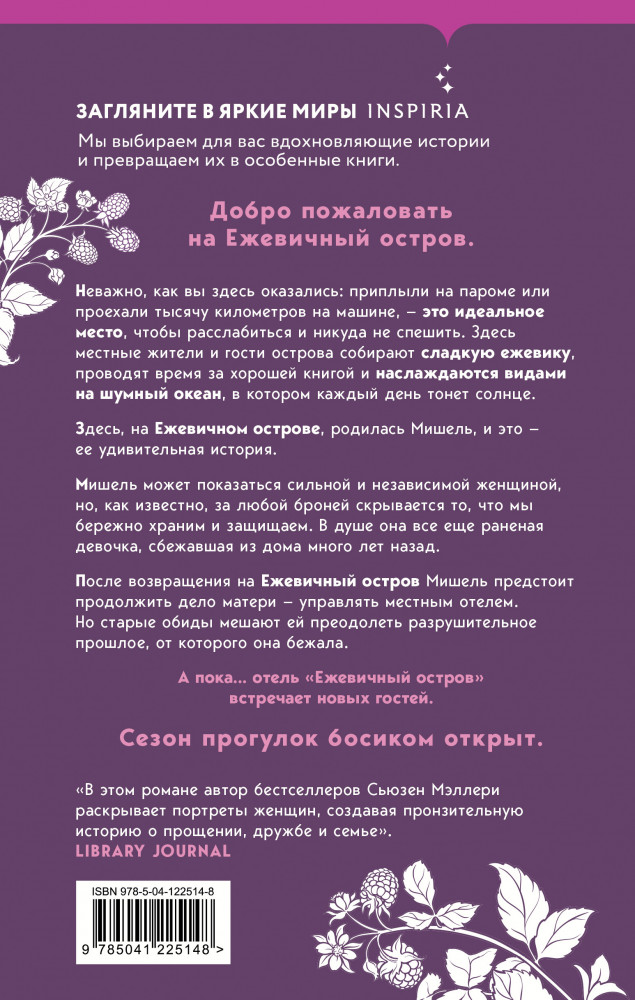 Сезон прогулок босикомВ данный момент этот товар отсутствует в продаже. Возможно, у нас найдется аналогичный или похожий товар здесь. Серия: Cupcake. Ежевичный остров Сьюзен Мэллери Добро пожаловать на Ежевичный остров. Неважно, как вы здесь оказались; приплыли на пароме или проехали тысячу километров на машине, — это идеальное место, чтобы расслабиться и никуда не спешить. Здесь местные жители и гости острова собирают сладкую ежевику, проводят время за хорошей книгой и наслаждаются видами на шумный океан, в котором каждый день тонет солнце. |