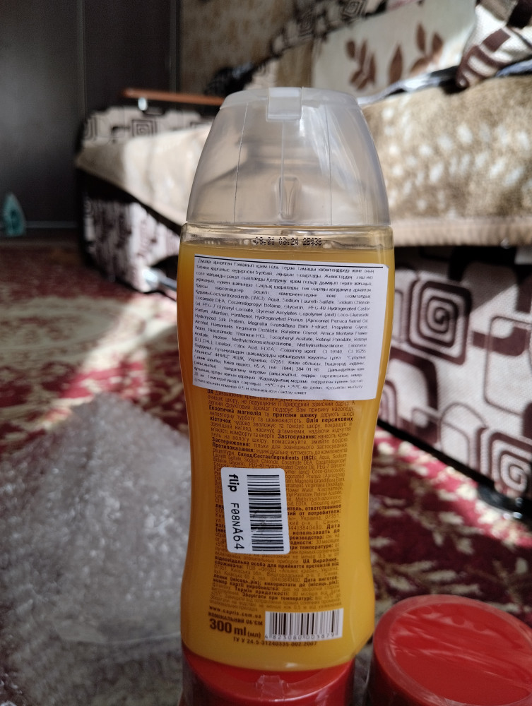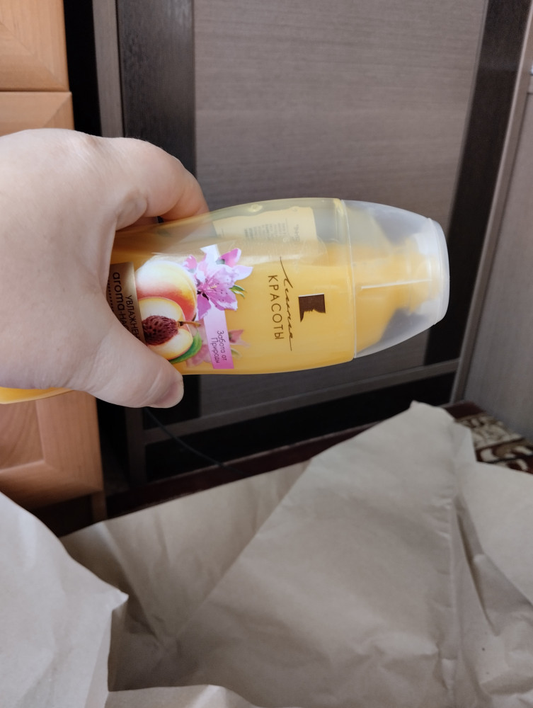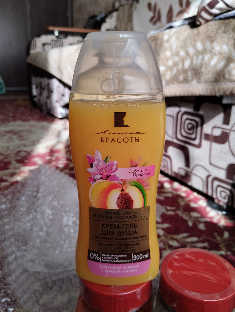 Гель магнолия-персик. Все, как на фото, даже уровень геля во флаконе (хотя там до верха ещё грамм 100 может вместиться, но, вероятно, так должно быть). Приятного цвета. Запах персика с карамелью, нежный, не навязчивый. Сняла одну звезду за то, что гель, на мой взгляд, немного жидковат (не критично). И при открытии на крышке были следы, словно флакон протек.