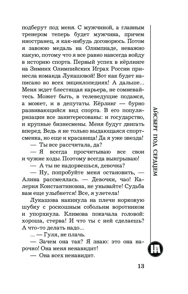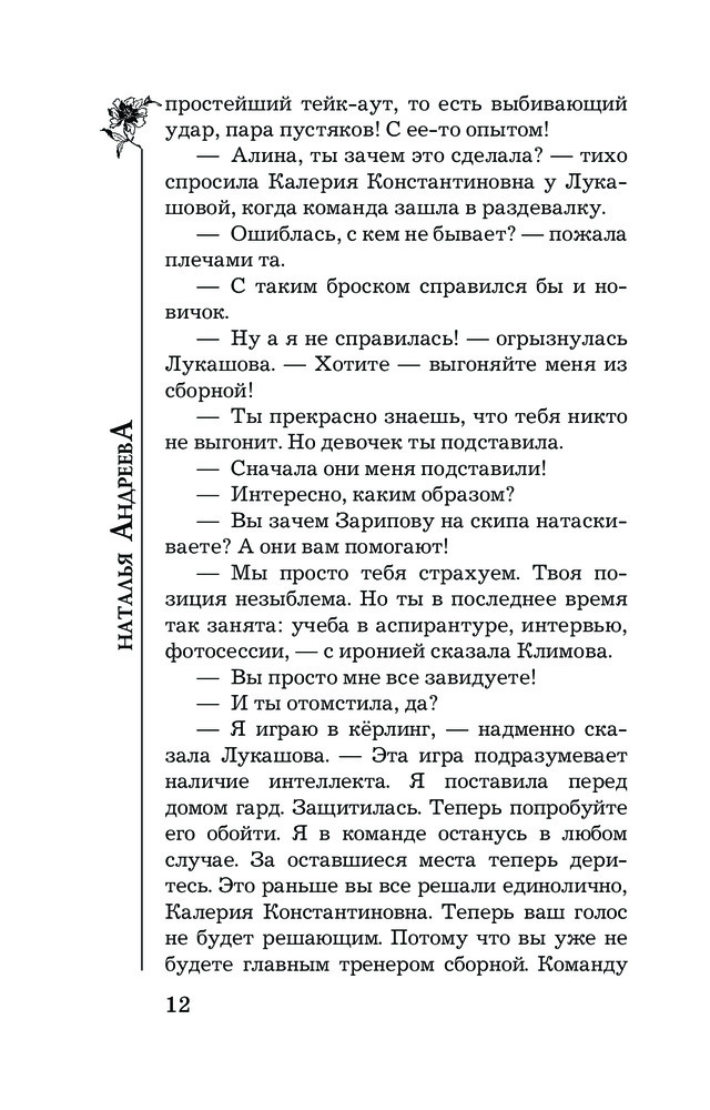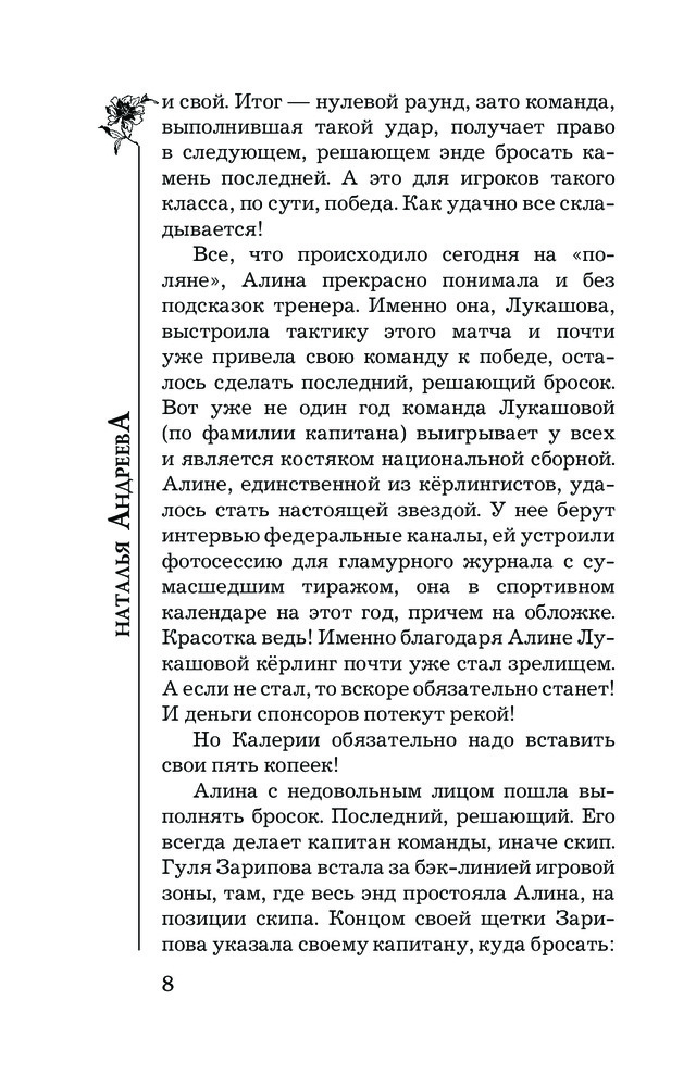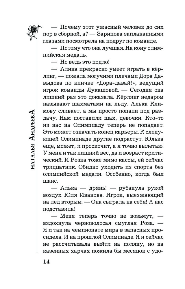 💳 Оплатить за товар можно при получении 🇰🇿 Есть бесплатная доставка по Казахстану от 1 дня 🎁 Копите бонусы с каждой покупки Серия: Бестселлеры Натальи Андреевой (м) Керлинг — это древнейший вид спорта, где царит благородство. Но именно знаменитую керлингистку Алину Лукашову увозят в больницу с тяжелейшей травмой: на нее, судя по всему, совершено покушение. Алексея Леонидова отправляют на базу, где готовятся олимпийцы, инкогнито, под видом помощника айс-мейкера. Психику спортсменов травмировать нельзя: на кону олимпийская медаль. Алексею предстоит выяснить, что происходит в команде и найти ту самую паршивую овцу, которая в сборную, к славе и большим деньгам идет по трупам. Но все меняется, когда между Леонидовым и главным тренером сборной Лерой Климовой начинается жаркий роман. Эта новая любовь ослепляет Алексея настолько, что он не видит очевидного: Климова виновна. Но насколько? Просто молчит, покрывая убийцу, или... убийца она. |