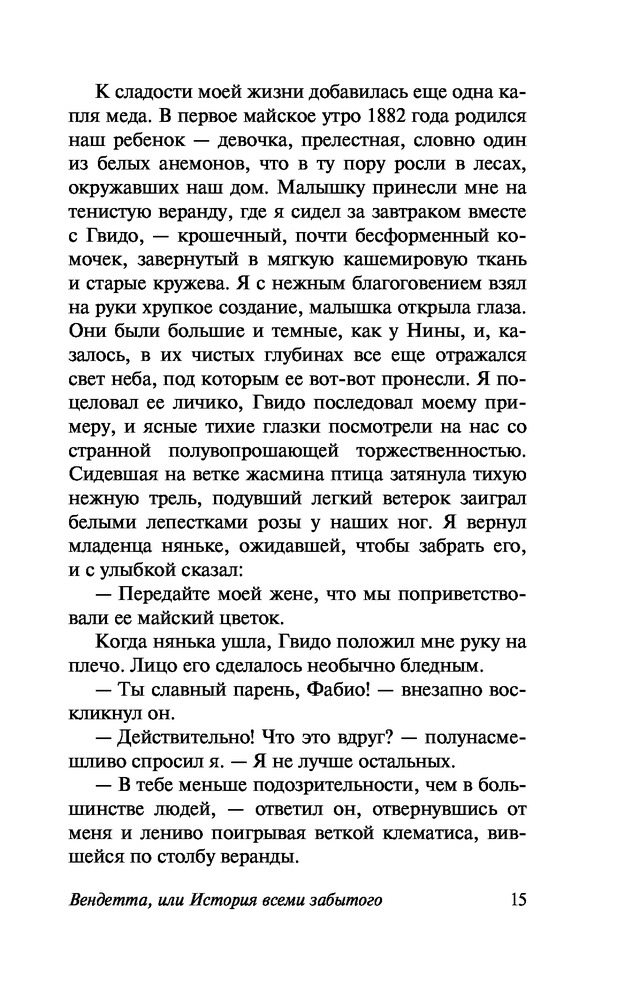 Месть - это блюдо, которое подают холодным. Это идеально подобранное выражение для этой книги. И, я скорее поняла, почему месть - холодна. Потому, что если ты принял решение мстить, то ты должен иметь холодную голову. Расчет. И никаких чувств. Главный герой - Фабио Романи - по трагической случайности заболевает холерой и впадает в глубокое беспамятство. Но, не смотря ни на что , выживает - хотя и платит своей внешностью. Впредь вместо брюнета на нас смотрит седовласый старик восставший из фамильного склепа. Обрадованный тем, что он выжил, он спешит домой. Ведь там его жена, которая наверняка в глубокой скорби из за его кончины. А так же его друг, не менее скорбевший по нему. Два самых дорогих человека в жизни Фабио. И какое же было его разочарование, когда он тайно увидел уединение его жены вместе с его самым близким другом. И услышал их разговор о том, как они рады, что Фабио так быстро скончался и теперь они могут, спустя полгода, заявить о своих отношениях открыто. сердце главного героя разбилось на тысячи осколков. И вместо ежесекундной расправы над этими людьми, дабы очистить свою честь, он решает на более глубокий ход. Фабио решает мстить. И уже через несколько недель возвращается в город, в темных очках и большой молвой, что якобы некий новый граф появился в уезде и который сыплет богатствами налево и направо. Дальше, уже не буду говорить, иначе пойдут спойлеры. Книга несёт в себе тему измен, много обсуждения на эту тему. Я прониклась к главному герою. Искренне понимала его боль. Не смотря на всю горечь ситуации, Фабио вел себя как истинный джентельмен и человек чести. он мстил красиво. «Я в прямом смысле разрывался между любовь и ненавистью. Любовью - порожденной лишь физическим влечением и ненавистью, порожденной глубокой душевной раной, излечить которую было едва ли возможно.»