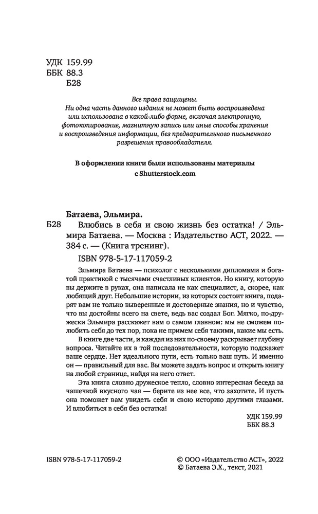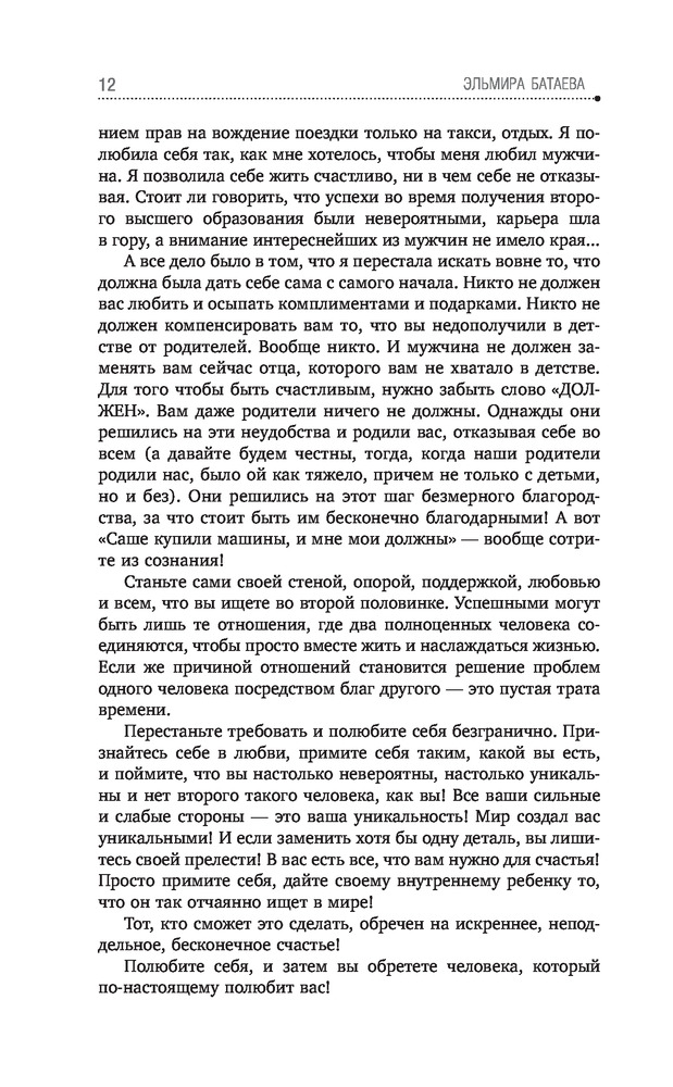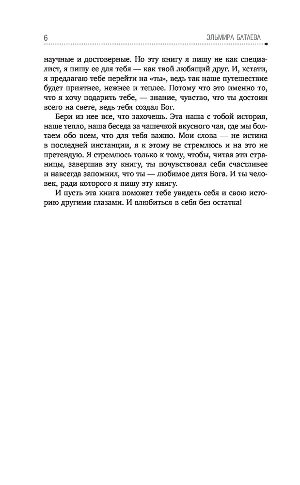 💳 Оплатить за товар можно при получении 🇰🇿 Есть бесплатная доставка по Казахстану от 1 дня 🎁 Копите бонусы с каждой покупки Серия: Книга тренинг Эльмира Батаева — психолог с несколькими дипломами и богатой практикой с тысячами счастливых клиентов. Но книгу, которую вы держите в руках, она написала не как специалист, а, скорее, как любящий друг. Небольшие истории, из которых состоит книга, подарят вам не только выверенные и достоверные знания, но и чувство, что вы достойны всего на свете, ведь вас создал Бог. Мягко, по-дружески Эльмира расскажет вам о самом главном: мы не сможем полюбить себя до тех пор, пока не примем себя такими, какие мы есть. |