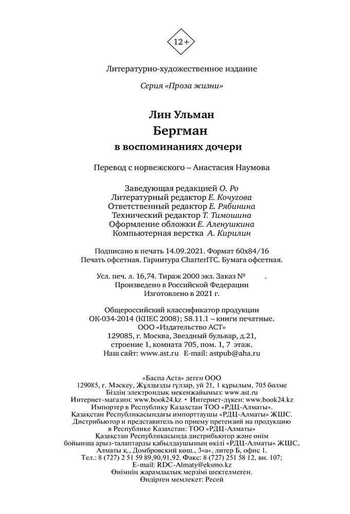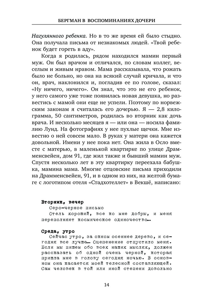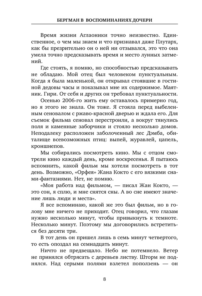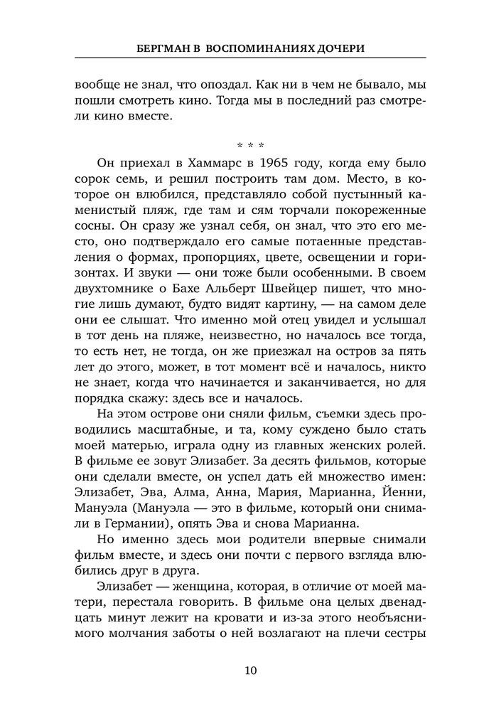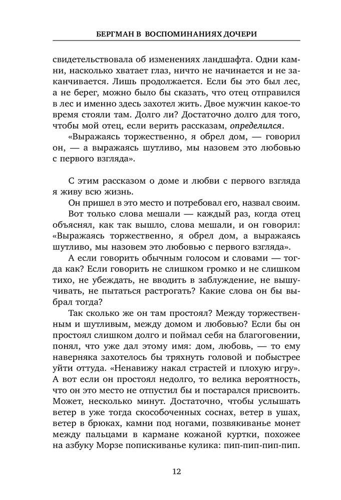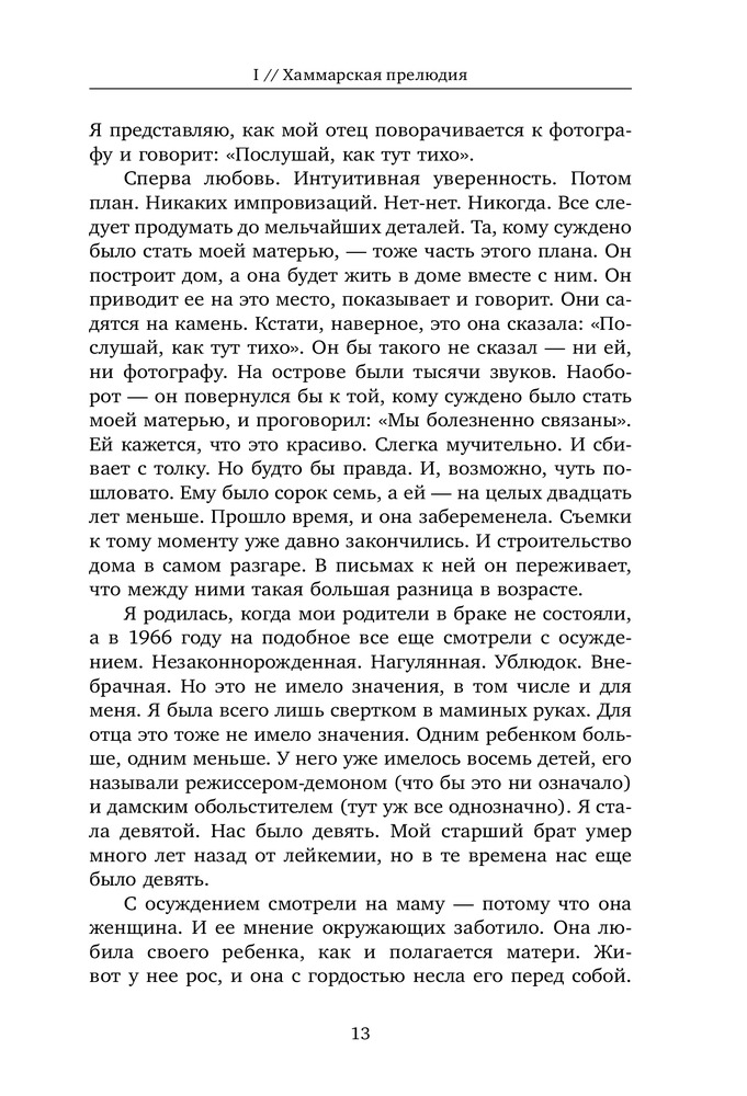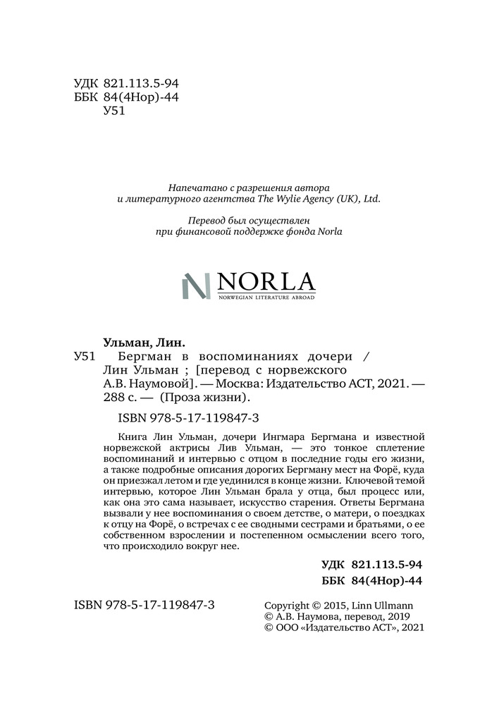 Серия: Проза жизни Книга Лин Ульман, дочери Ингмара Бергмана и известной норвежской актрисы Лив Ульман — это тонкое сплетение воспоминаний и интервью с отцом в последние годы его жизни, а также подробные описания дорогих Бергману мест на Форё, куда он приезжал летом, и где уединился в конце жизни. Ключевой темой интервью, которое Лин Ульман брала у отца, был процесс или, как она это сама называет, искусство старения. Ответы Бергмана вызвали у нее воспоминания о своем детстве, о матери, о поездках к отцу на Форё, о встречах с ее сводными сестрами и братьями, о ее собственном взрослении и постепенном осмыслении всего того, что происходило вокруг нее. |