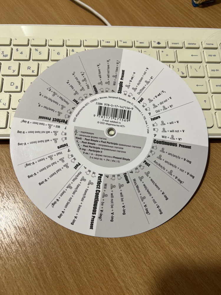 💳 Оплатить за товар можно при получении 🇰🇿 Есть бесплатная доставка по Казахстану 🎁 Копите бонусы с каждой покупки Серия: Диск-вертушка Диск-вертушка с временами английского глагола отлично подойдет всем тем, кто изучает английский язык. На подвижной части расположены окошки, позволяющие совместить нужные варианты употребления глагола в том или ином времени. Наглядная подача материала позволит легко и быстро выучить времена английского глагола. |