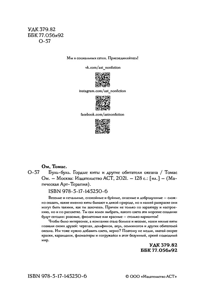 Буль-буль. Гордые киты и другие обитатели океанаВ данный момент этот товар отсутствует в продаже. Возможно, у нас найдется аналогичный или похожий товар здесь. Серия: Магическая Арт-Терапия Веселые и печальные, спокойные и буйные, опасные и добродушные — сложно сказать, какие именно киты бывают в дикой природе, но в нашей раскраске они могут быть такими, как ты захочешь. Причем не только по характеру и настроению, но и по расцветке. Ты сам волен выбрать, какого цвета эти морские создания будут сегодня: розовые, фиолетовые или красные — столько вариантов! |
