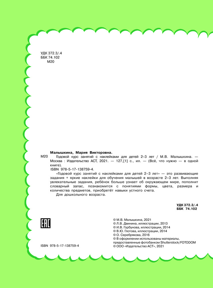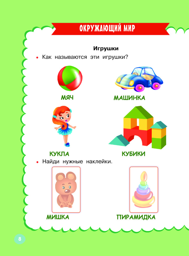 Годовой курс занятий с наклейками для детей 2-3 летВ данный момент этот товар отсутствует в продаже. Возможно, у нас найдется аналогичный или похожий товар здесь. Серия: Всё, что нужно знать — в одной книге «Годовой курс занятий с наклейками для детей 2-3 лет». Выполняя увлекательные задания, ребёнок больше узнает об окружающем его мире, значительно пополнит словарный запас, познакомится с понятиями формы, цвета, размера и количества предметов, приобретёт навыки устного счёта. В книге 64 цветные наклейки, которые малыш с удовольствием будет наклеивать в книгу. |