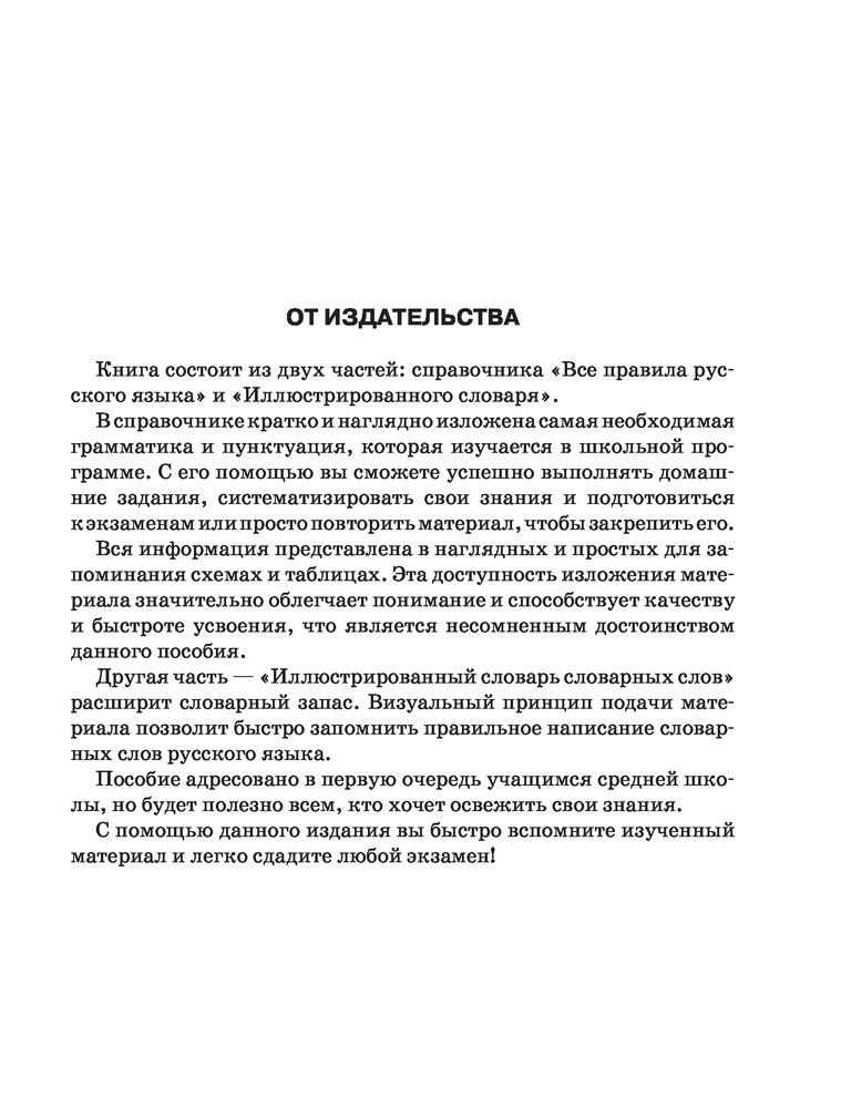 Пособие состоит из двух частей. В первой части содержатся все правила русского языка. Чёткие схемы и наглядные таблицы помогут эффективно усвоить или повторить любую грамматическую тему. В качестве примеров приводятся отрывки из живой речи и художественной литературы.