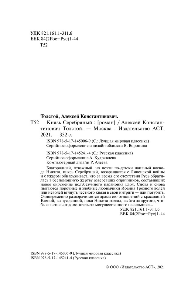 Князь СеребряныйАлексей Константинович Толстой В данный момент этот товар отсутствует в продаже. Возможно, у нас найдется аналогичный или похожий товар здесь. Серия: Лучшая мировая классика Благородный, отважный, но почти по-детски наивный воевода Никита, Князь Серебряный, возвращается с Ливонской войны и с ужасом обнаруживает, что за время его отсутствия Русь обратилась в беспомощную жертву озверевших опричников, составивших новое окружение полубезумного параноика царя. Снова и снова пытаются порочные и злобные любимчики Иоанна Грозного волей или неволей втянуть честного князя в свои интриги — или погубить. Одновременно разворачивается драма его отношений с красавицей Еленой, вынужденной, пока Никита воевал, выйти за другого, чтобы спастись от домогательств могущественного насильника... |