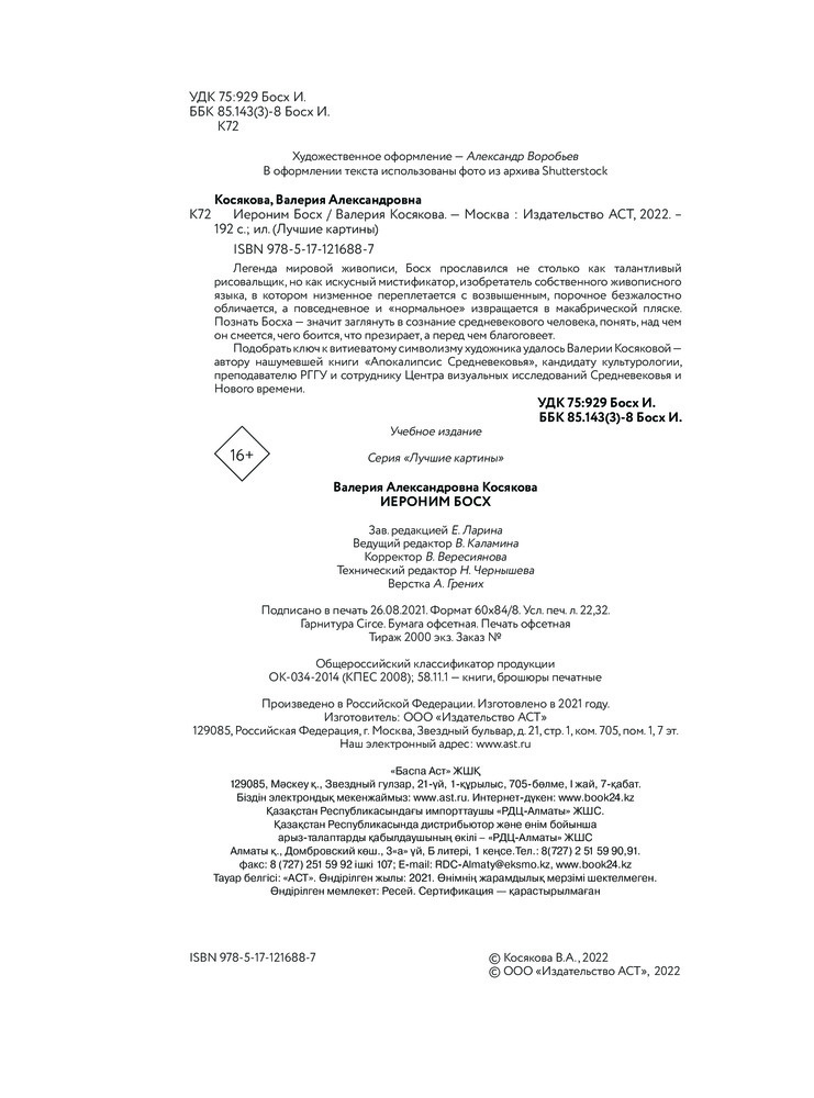 Иероним БосхВалерия Александровна Косякова В данный момент этот товар отсутствует в продаже. Возможно, у нас найдется аналогичный или похожий товар здесь. Серия: Лучшие картины Автор рассказывает, кем же на самом деле был Иероним Босх. Познать Босха — значит, понять само Средневековье. Легенда мировой живописи, Босх прославился не столько как талантливый рисовальщик, но как искусный мистификатор, изобретатель собственного живописного языка, в котором низменное переплетается с возвышенным, порочное безжалостно обличается, а повседневное и «нормальное» извращается в макабрической пляске. |