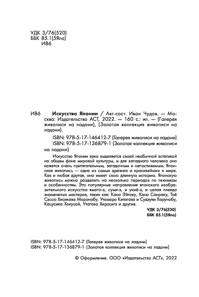 💳 Оплатить за товар можно при получении 🇰🇿 Есть бесплатная доставка по Казахстану от 1 дня 🎁 Копите бонусы с каждой покупки Серия: Галерея живописи на ладони Япония маленькая, загадочная и не всегда понятная для европейцев страна, расположенная на островах. Географическое положение, особенности государственной политики и древние традиции народа привели к ее изолированности от других стран. В силу этого культура и искусство Японии приобрели ярко выраженные уникальные черты, обладающие особой притягательностью в гравюре и живописи. Живопись Японии принадлежит к числу самых древних и удивительных видов творчества. Как и любая другая, она имеет длинную историю, представляющую собой долгий путь соперничества и переплетения исконных японских принципов, адаптаций иностранных идей, смену школ и стилей. Это ямато-э и суми-э, и одно из популярнейших направлений японского изобразительного искусства периода Эдо — гравюра укиё-э. Это целая плеяда знаменитых мастеров, таких как: Кано Эйтоку, Кано Санраку, Тоё Сэссю, Хисикава Моронобу, Утамаро Китагава и Судзуки Харунобу, Кацусика Хокусай, Утагава Хиросигэ и другие. |