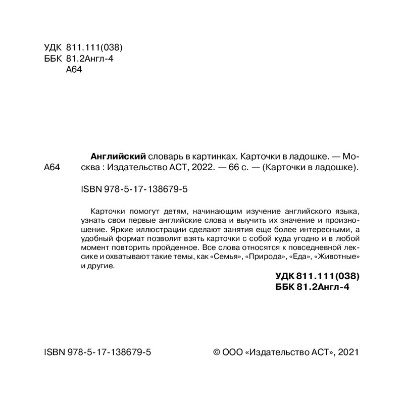 Английский словарь в картинках. Карточки в ладошкеВ данный момент этот товар отсутствует в продаже. Возможно, у нас найдется аналогичный или похожий товар здесь. Серия: Карточки в ладошке Карточки помогут детям, начинающим изучение английского языка, узнать свои первые английские слова и выучить их значение и произношение. Яркие иллюстрации сделают занятия еще более интересными, а удобный формат позволит взять карточки с собой куда угодно и в любой момент повторить пройденное. Все слова относятся к повседневной лексике и охватывают такие темы, как «Семья», «Природа», «Еда», «Животные» и другие. |