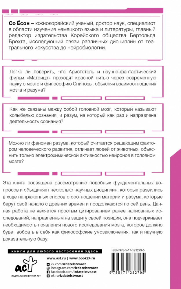 В данный момент этот товар отсутствует в продаже. Возможно, у нас найдется аналогичный или похожий товар здесь. Серия: Удивительная наука Со Ёсон — южнокорейский ученый, доктор наук, специалист в области изучения немецкого языка и литературы, главный редактор издательства Корейского общества Бертольда Брехта, исследующий связи различных дисциплин от театрального искусства до нейробиологии.