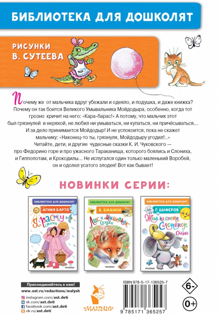 Мойдодыр. Сказки. Рисунки В. СутееваВ данный момент этот товар отсутствует в продаже. Возможно, у нас найдется аналогичный или похожий товар здесь. Серия: Библиотека для дошколят В книгу К. Чуковского «Мойдодыр. Сказки» серии «Библиотека для дошколят» вошли три сказки в стихах: «Мойдодыр», «Федорино горе» и «Тараканище». Вот уже сто лет читают дети сказки дедушки Корнея. И в каждом доме, где живёт ребёнок, живут и книги Корнея Ивановича Чуковского. |