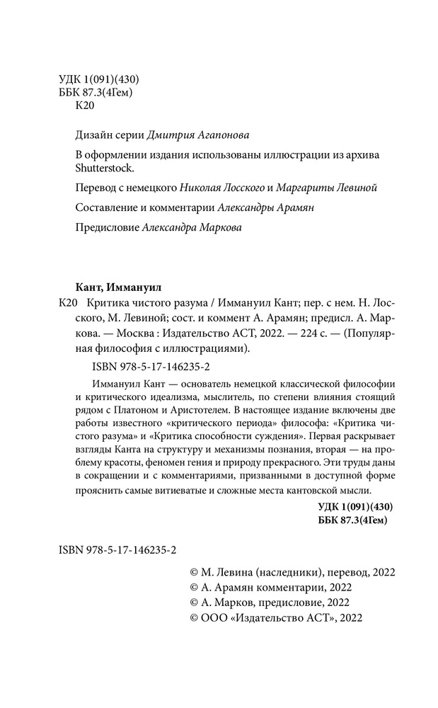 В данный момент этот товар отсутствует в продаже. Возможно, у нас найдется аналогичный или похожий товар здесь. Серия: Популярная философия с иллюстрациями Труды одного из самых популярных философов не только прошлых столетий, но и современности! Иммануил Кант — основатель немецкой классической философии и критического идеализма, мыслитель, по степени влияния стоящий рядом с Платоном и Аристотелем. В настоящее издание включены две работы известного «критического периода» философа: «Критика чистого разума» и «Критика способности суждения». Первая раскрывает взгляды Канта на структуру и механизмы познания, вторая — на проблему красоты, феномен гения и природу прекрасного. Эти труды даны в сокращении и с комментариями, призванными в доступной форме прояснить самые витиеватые и сложные места кантовской мысли. |