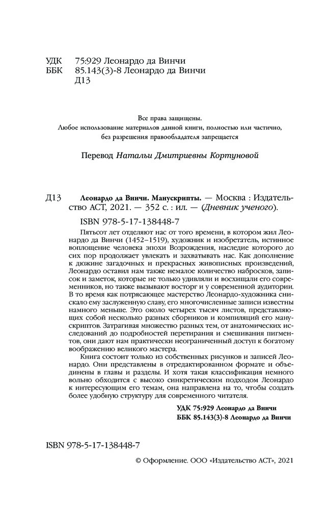 💳 Оплатить за товар можно при получении 🇰🇿 Есть бесплатная доставка по Казахстану 🎁 Копите бонусы с каждой покупки Серия: Дневник ученого Пятьсот лет отделяют нас от того времени, в котором жил Леонардо да Винчи (1452–1519), художник и изобретатель, истинное воплощение человека эпохи Возрождения, наследие которого до сих пор продолжает увлекать и захватывать нас. Как дополнение к дюжине загадочных и прекрасных живописных произведений, Леонардо оставил нам также немалое количество набросков, записок и заметок, которые не только удивляли и восхищали его современников, но также вызывают восторг и у современной аудитории. В то время как потрясающее мастерство Леонардо-художника снискало ему заслуженную славу, его многочисленные записи известны намного меньше. Это около четырех тысяч листов, представляющих собой несколько разных сборников и компиляций его манускриптов. Затрагивая множество разных тем, от анатомических исследований до подробностей перетирания и смешивания пигментов, они дают нам практически неограниченный доступ к богатому воображению великого мастера. Книга состоит только из собственных рисунков и записей Леонардо. Они представлены в отредактированном формате и объединены в главы и разделы. И хотя такая классификация немного вольно обходится с высоко синкретическим подходом Леонардо к интересующим его темам, она направлена на то, чтобы создать более удобную структуру для современного читателя. |