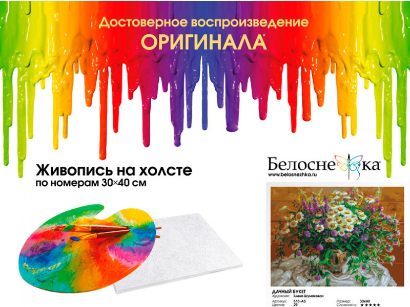 Внимание! Краски могут подсохнуть или быть слишком густыми — это не является браком, в этом случае добавьте небольшое количество воды и хорошо размешайте краску. Рекомендуем раскрашивать картину без длительных перерывов, чтобы краска в баночках не высыхала.