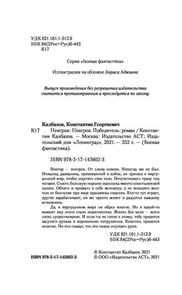 💳 Оплатить за товар можно при получении 🇰🇿 Есть бесплатная доставка по Казахстану 🎁 Копите бонусы с каждой покупки Серия: Боевая фантастика Виктор — неигрок. От слова совсем. Никогда им не был. Инвалид, развалина, прикованный к койке, он пришел в виртуальный мир, чтобы ощутить свое тело. Почувствовать траву под ногами. Съесть большую порцию шашлыка вместо опостылевшей кашки. Обнять и прижать к себе женщину, а не исходить желчью от бессилия при виде красавицы сиделки. Кто-то тут играет, другие зарабатывают, он же просто живет и радуется каждому мгновению. |