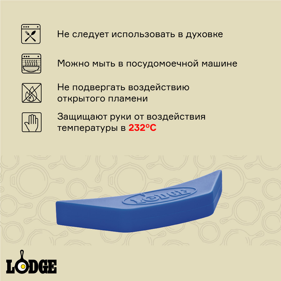 Силиконовая прихватка защитит руки от ожогов во время готовки. Изделие защищает руки от воздействия температуры до 232 ℃. Прихватка подходит для большинства трапецевидных ручек товаров Lodge.