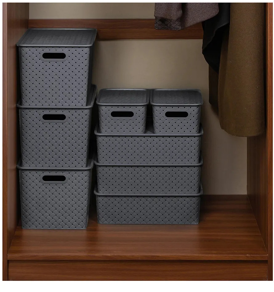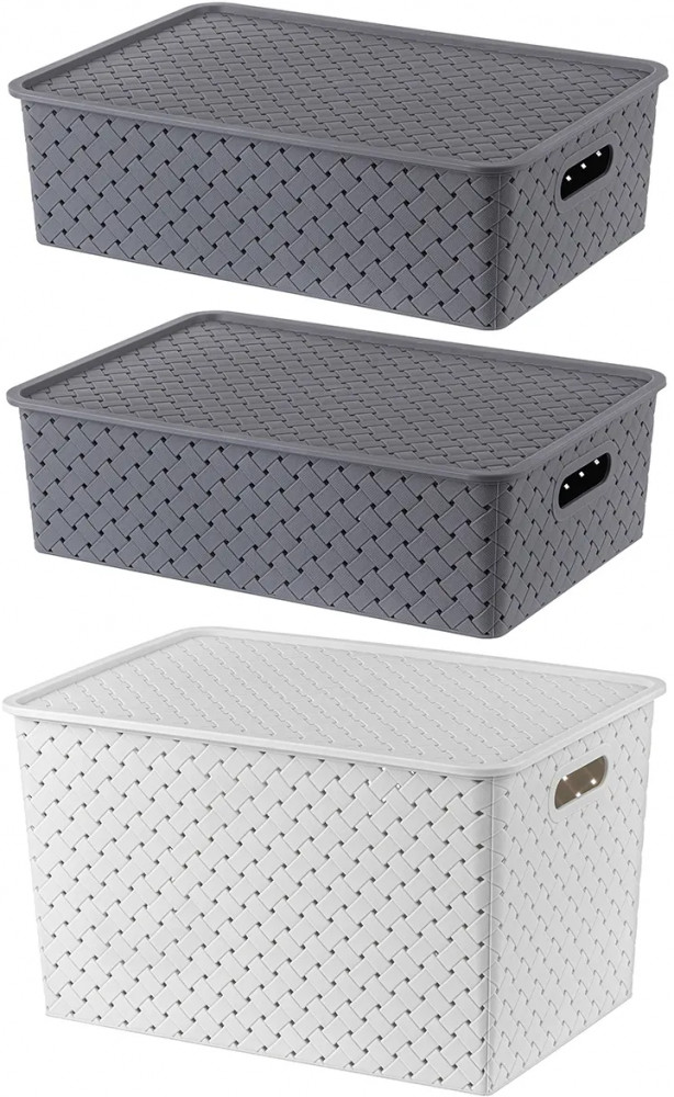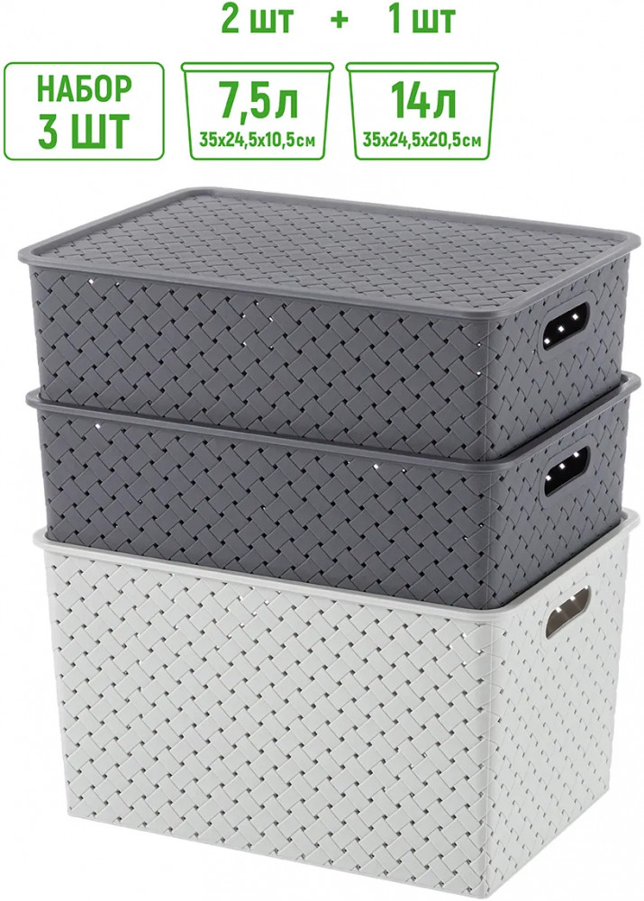 Корзинки объемом 7,5 л и 14 л с крышкой выполнены из качественного прочного пластика с двумя ручками-выемками. Крышка плотно закрывается, а специальное плетение с дырочками позволяет воздуху проникать внутрь и не дает продуктам испортиться от недостатка кислорода. В корзинке можно хранить как овощи и фрукты, так и хозяйственные предметы. Крышки корзинки сконструированы таким образом, что корзинки разных размеров можно удобно и надежно разместить друг на друге, составив удобный и функциональный набор. Корзинки представлены разных объемов, форм и расцветок, что позволит собрать уникальный набор, подходящий под ваши потребности.