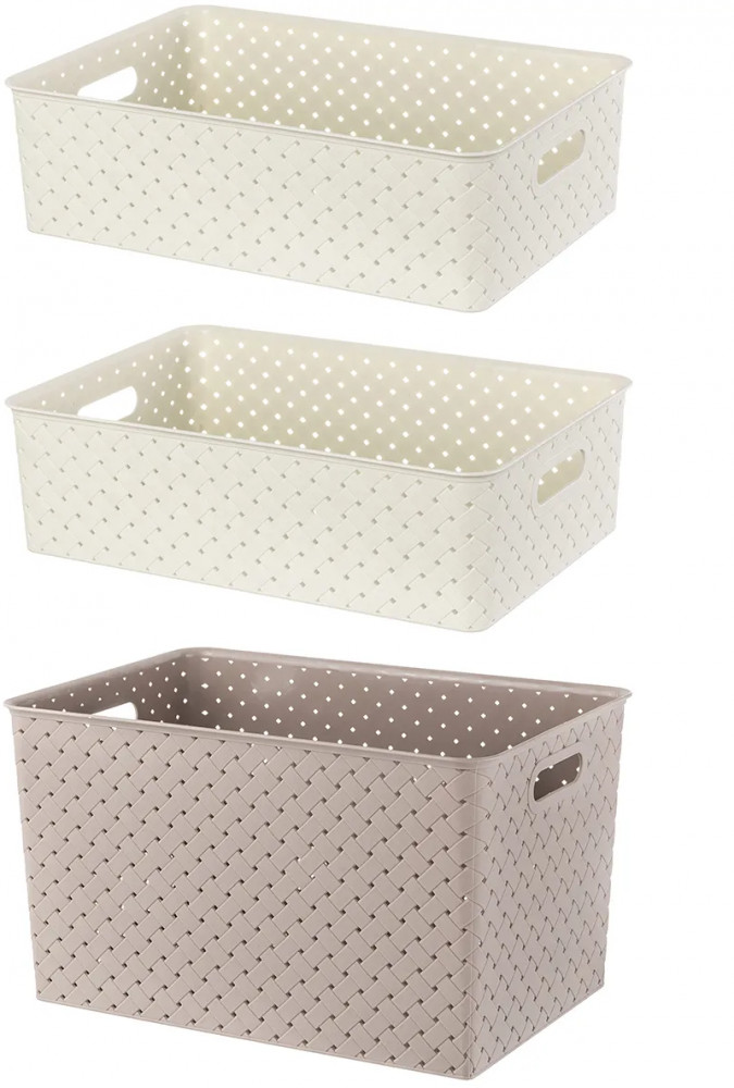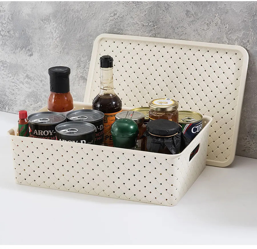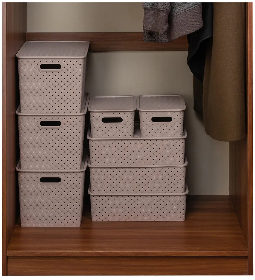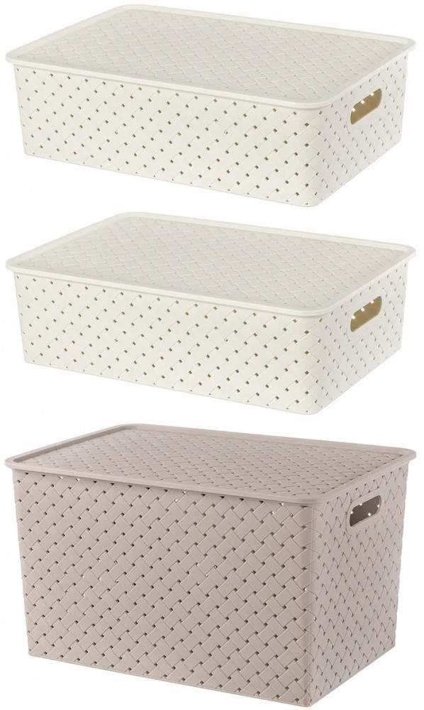 Корзинки объемом 7,5 л и 14 л с крышкой выполнены из качественного прочного пластика с двумя ручками-выемками. Крышка плотно закрывается, а специальное плетение с дырочками позволяет воздуху проникать внутрь и не дает продуктам испортиться от недостатка кислорода. В корзинке можно хранить как овощи и фрукты, так и хозяйственные предметы. Крышки корзинки сконструированы таким образом, что корзинки разных размеров можно удобно и надежно разместить друг на друге, составив удобный и функциональный набор. Корзинки представлены разных объемов, форм и расцветок, что позволит собрать уникальный набор, подходящий под ваши потребности.