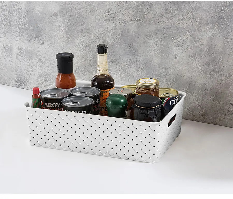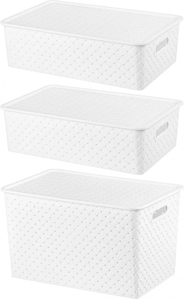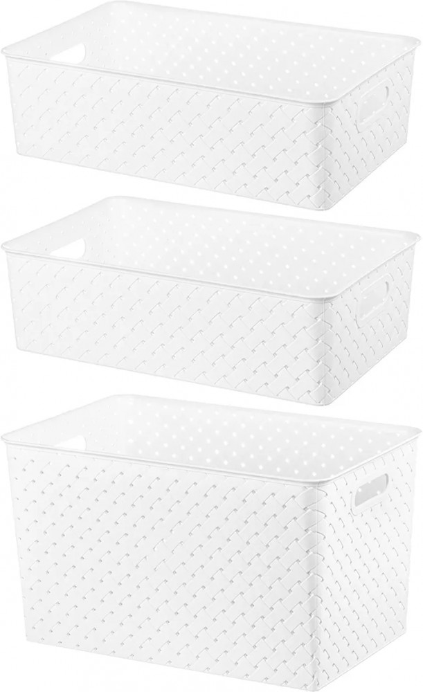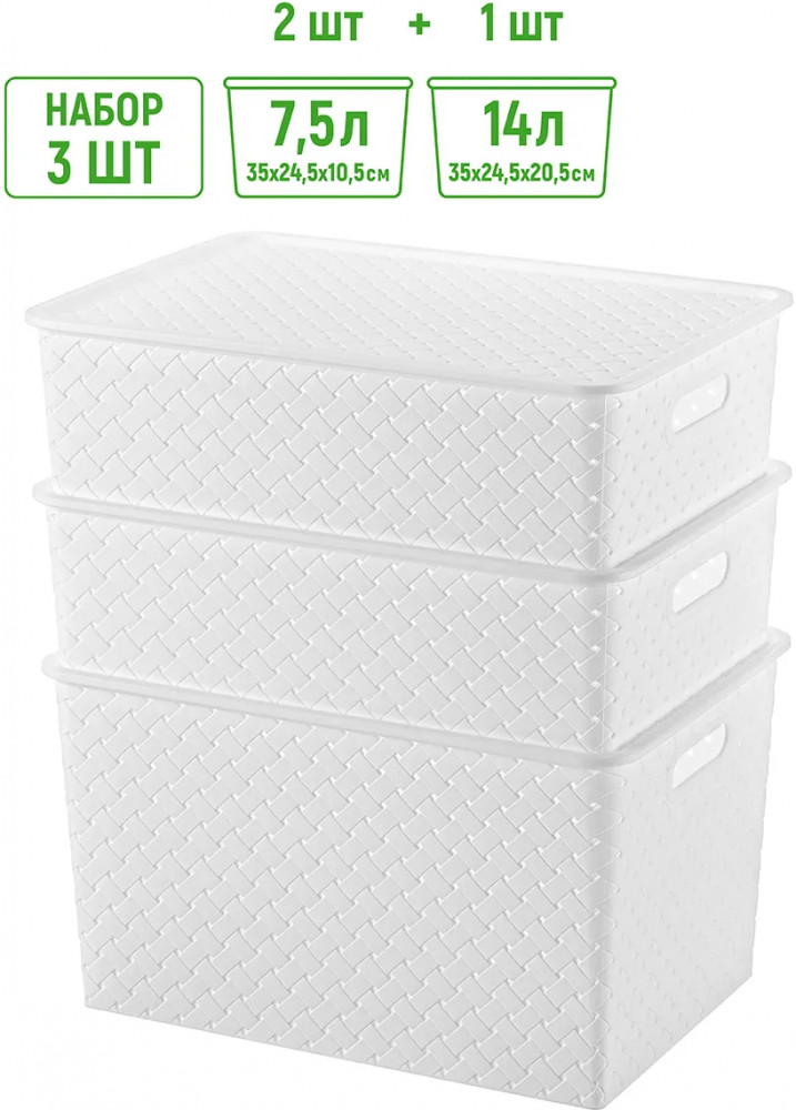 Корзинки объемом 7,5 л и 14 л с крышкой выполнены из качественного прочного пластика с двумя ручками-выемками. Крышка плотно закрывается, а специальное плетение с дырочками позволяет воздуху проникать внутрь и не дает продуктам испортиться от недостатка кислорода. В корзинке можно хранить как овощи и фрукты, так и хозяйственные предметы. Крышки корзинки сконструированы таким образом, что корзинки разных размеров можно удобно и надежно разместить друг на друге, составив удобный и функциональный набор. Корзинки представлены разных объемов, форм и расцветок, что позволит собрать уникальный набор, подходящий под ваши потребности.