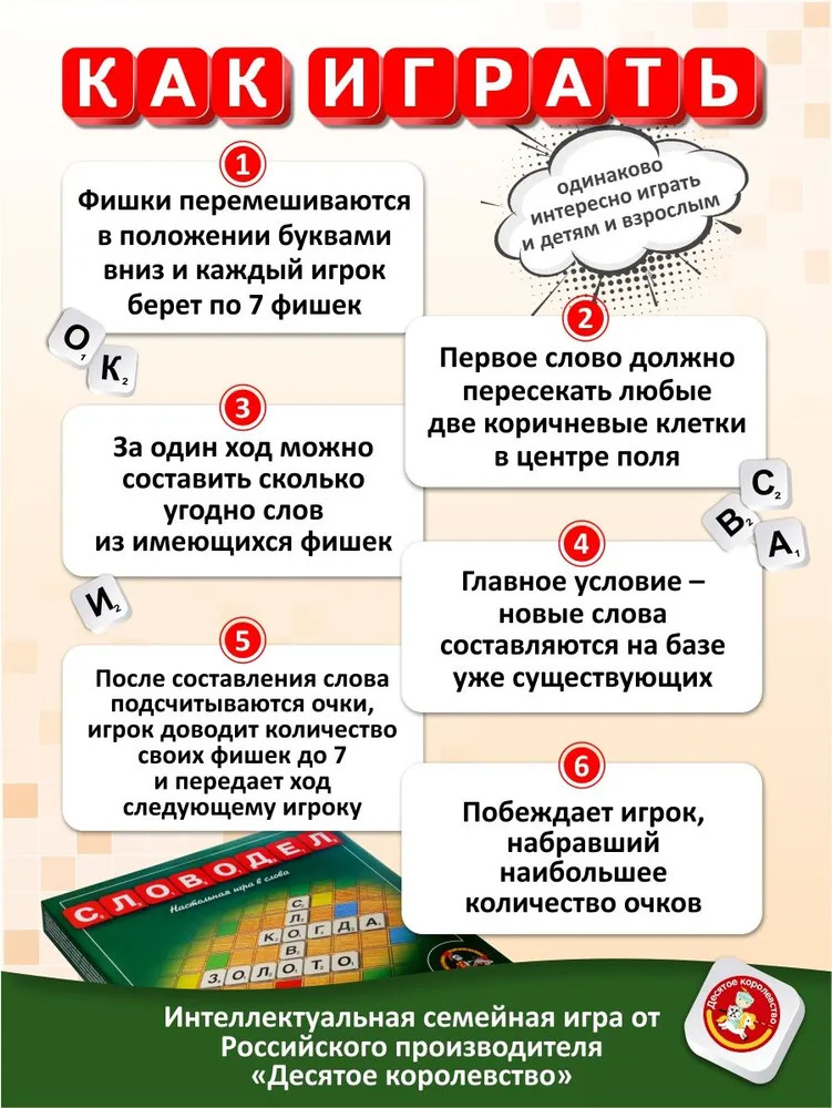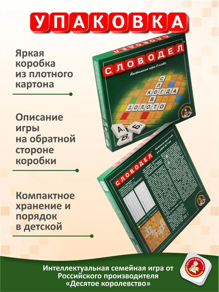 💳 Оплатить за товар можно при получении 🇰🇿 Есть бесплатная доставка по Казахстану от 1 дня 🎁 Копите бонусы с каждой покупки Настольная игра "Словодел" рассчитана на 2-4 игроков в возрасте от 7 лет. |