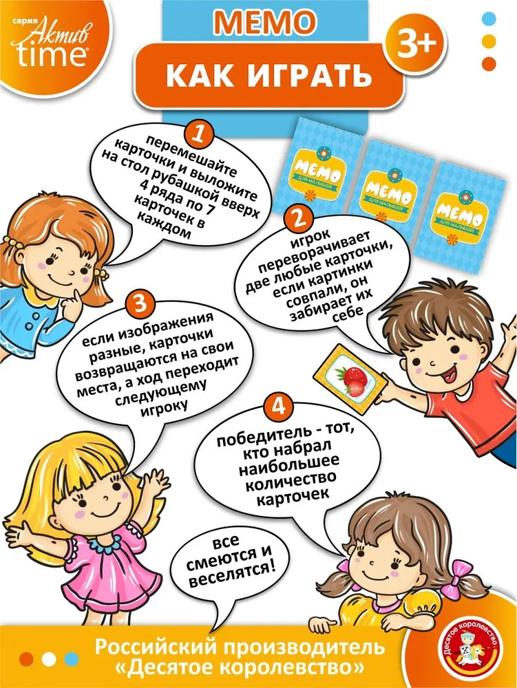 Переворачивайте любые 2 карточки. Если картинки на карточках совпали, заберите их себе. Если картинки на карточках оказались разными, переверните их обратно рубашкой вверх.