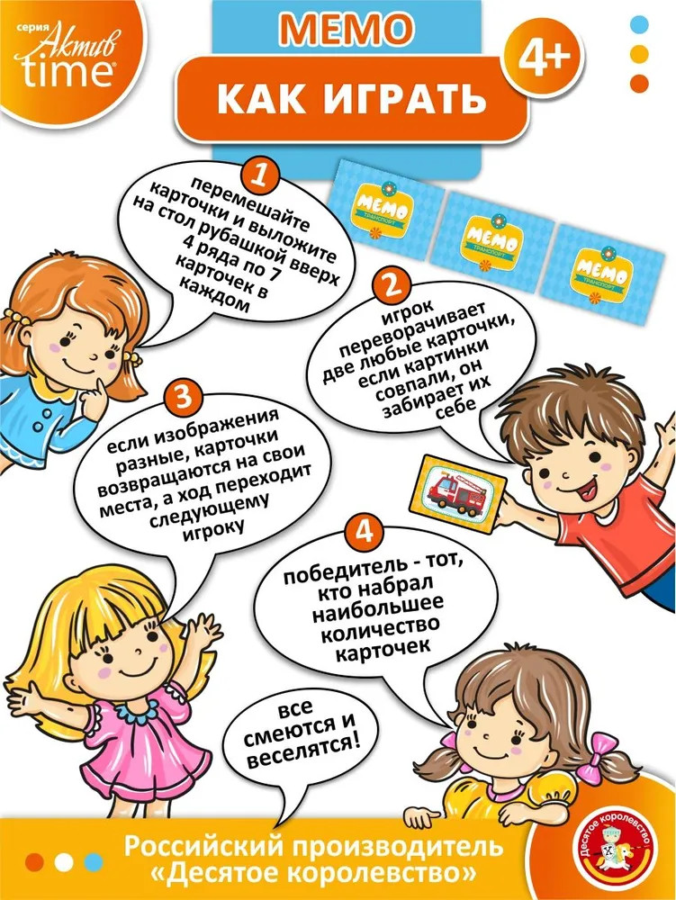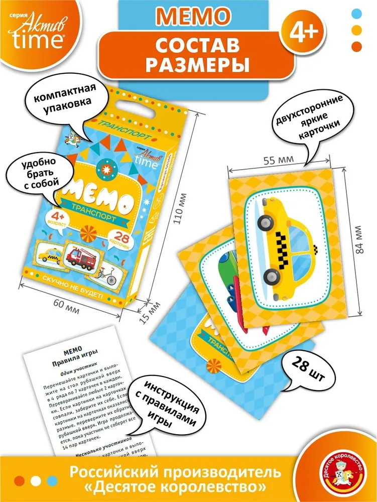 💳 Оплатить за товар можно при получении 🇰🇿 Есть бесплатная доставка по Казахстану от 1 дня 🎁 Копите бонусы с каждой покупки Серия: Актив time Устройте настоящую тренировку для своей памяти с настольной игрой Мемо «Транспорт» из серии развивающих игр «Актив Тайм». |