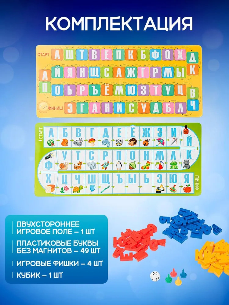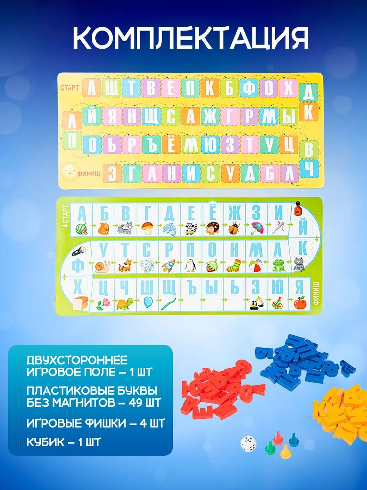 Вариант 2: игра продолжается, пока на поле не закончатся все пластиковые буквы. При этом варианте, если игрок дошел до финиша, но на поле еще остались пластиковые буквы, он продолжает участвовать, начиная со старта. Выигрывает тот, у кого в итоге окажется больше пластиковых букв.