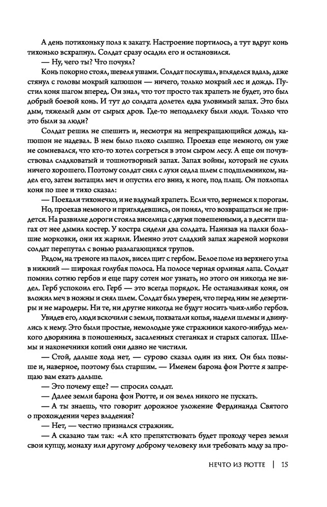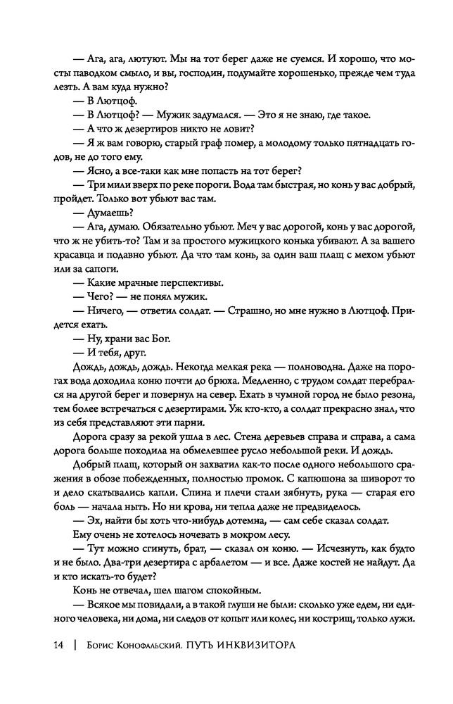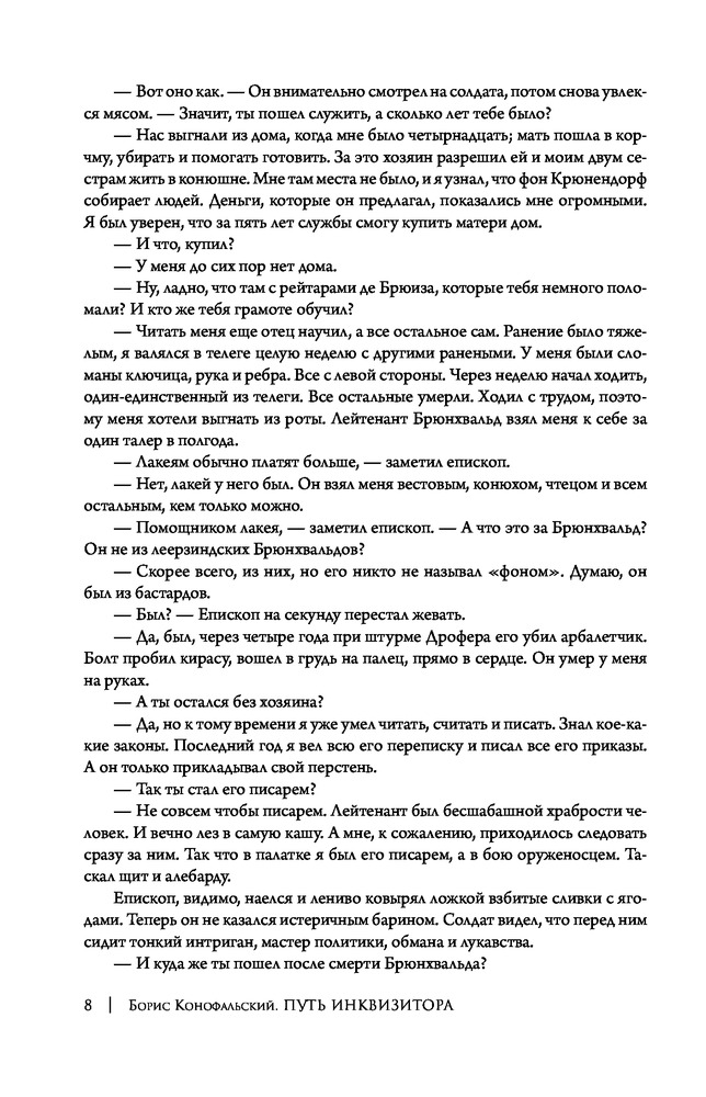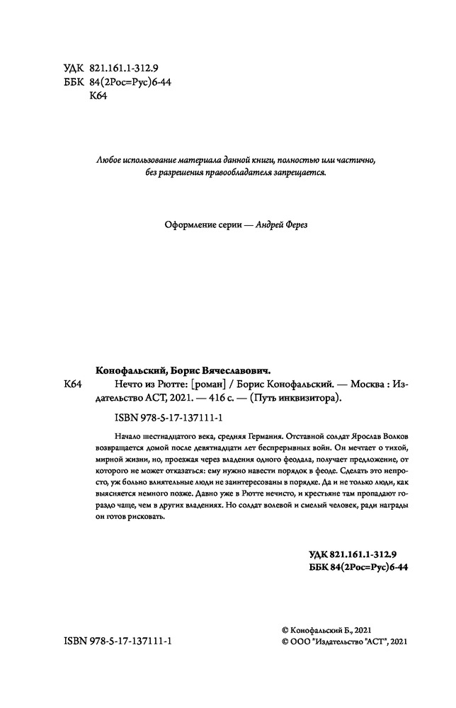 Нечто из РюттеБорис Вячеславович Конофальский В данный момент этот товар отсутствует в продаже. Возможно, у нас найдется аналогичный или похожий товар здесь. Серия: Путь инквизитора Начало шестнадцатого века, средняя Германия. Отставной солдат Ярослав Волков возвращается домой после девятнадцати лет беспрерывных воин. Он мечтает о тихой, мирной жизни, но, проезжая через владения одного феодала, получает предложение, от которого не может отказаться: ему нужно навести порядок в феоде. Сделать это непросто, уж больно влиятельные люди не заинтересованы в порядке. Да и не только люди, как выясняется немного позже. |