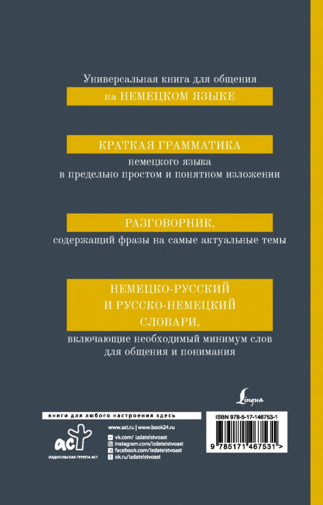 Немецкий язык. 4-в-1. Грамматика, разговорник, немецко-русский словарь, русско-немецкий словарьВ данный момент этот товар отсутствует в продаже. Возможно, у нас найдется аналогичный или похожий товар здесь. Серия: 4 книги в одной Данная книга представляет собой современный тип самоучителя и состоит из 4 частей, содержащих самые нужные материалы для обучения немецкому языку: раздел со сведениями по грамматике немецкого языка в предельно простом и понятном изложении, разговорник, а также немецко-русский и русско-немецкий словари. |