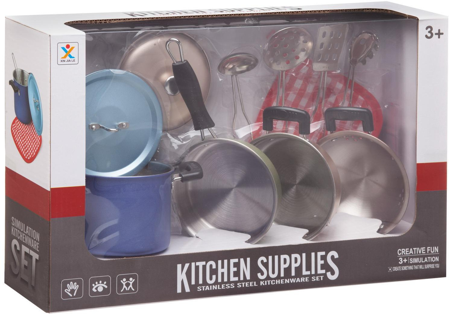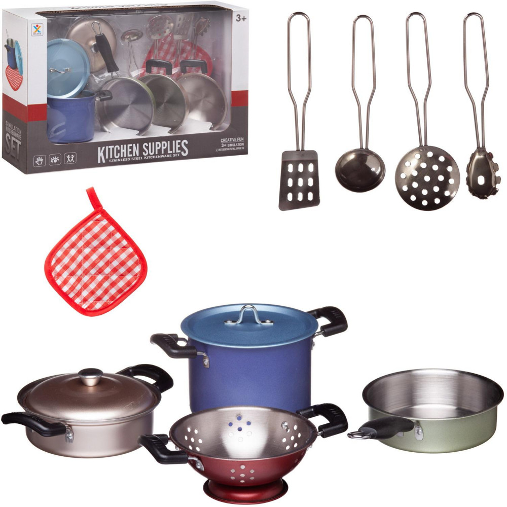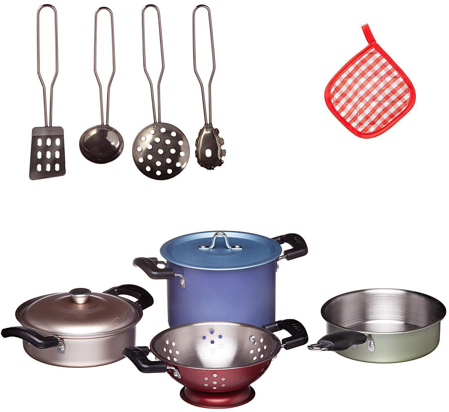 В наборе: кастрюля большая (14,7×6,7 см, диаметр 9,5 см) с крышкой (диаметр 10 см), сотейник (14,8×3 см, диаметр 9,5 см) с крышкой (диаметр 9,3 см), сковорода (19,5×3 см, диаметр 9,5 см), дуршлаг (14,5×4 см, диаметр 9,5 см), половник 12 см, лопатка 15 см, шумовка 15 см, ложка для спагетти 14 см, прихватка 13×16 см.