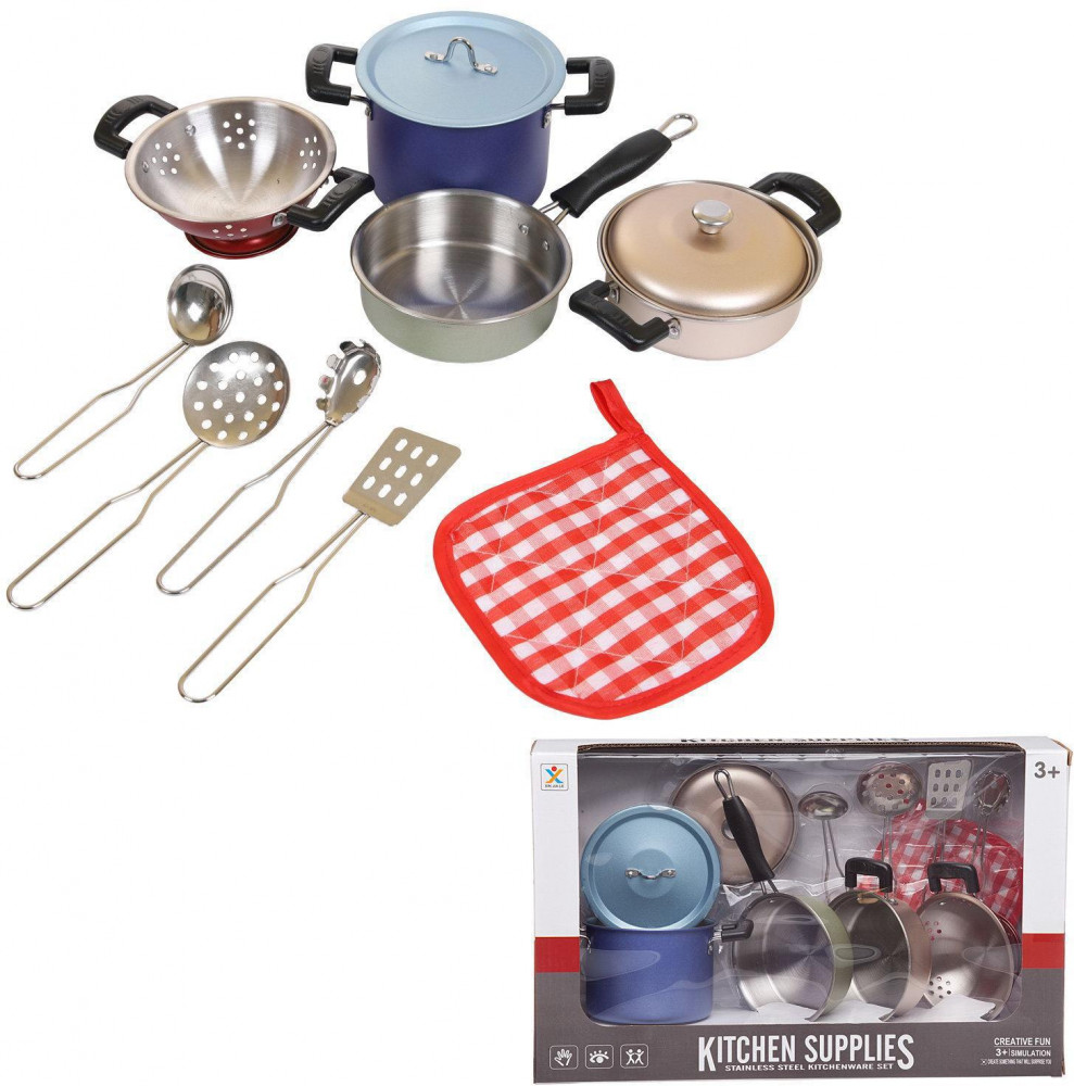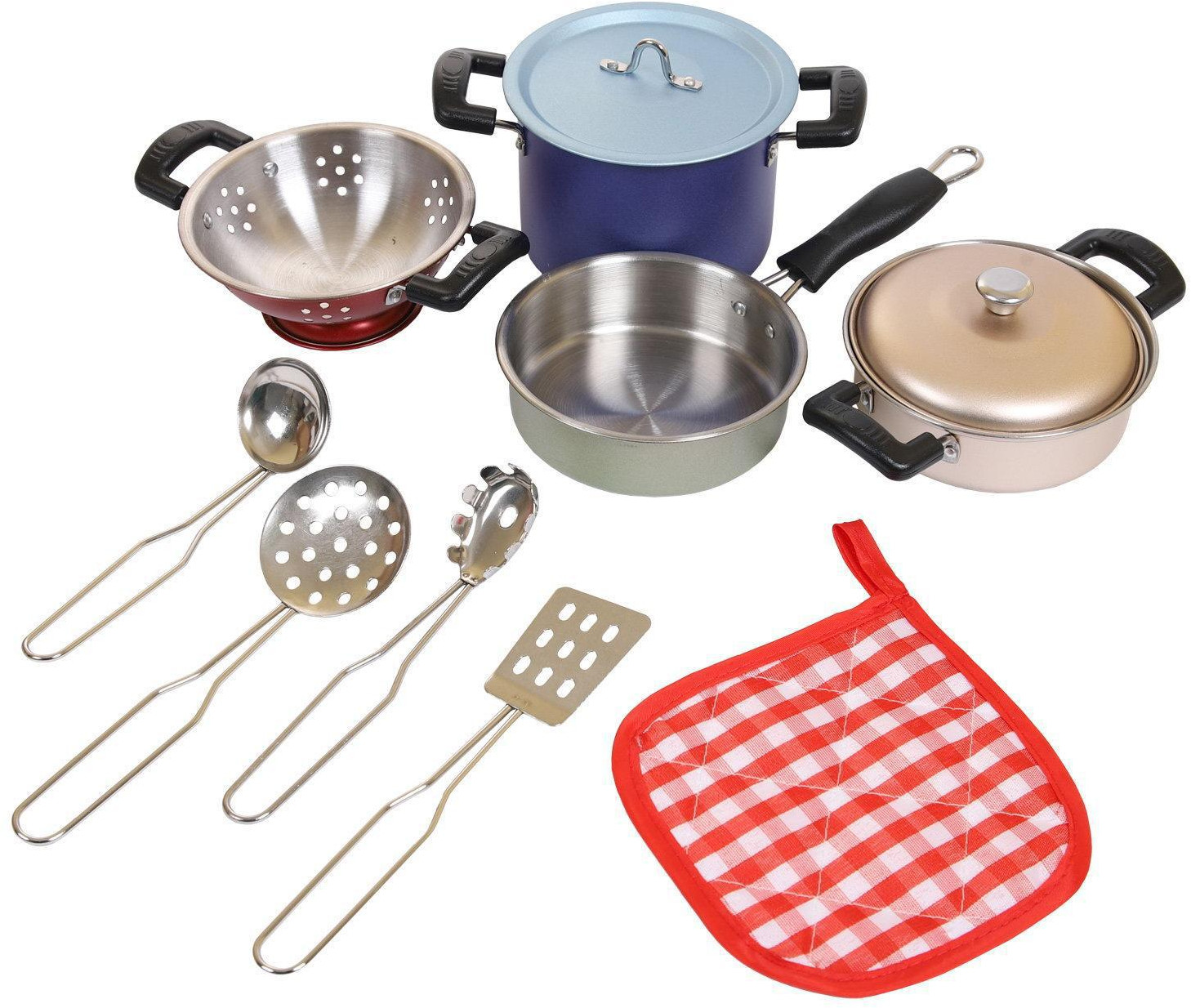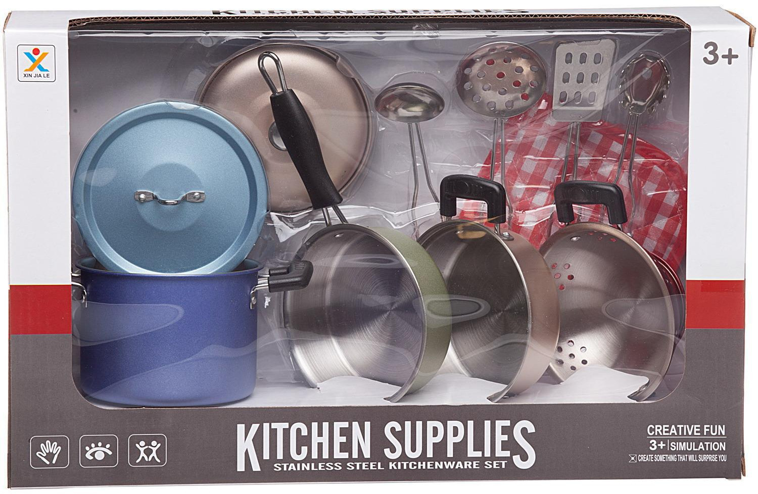 В наборе: кастрюля большая (14,7×6,7 см, диаметр 9,5 см) с крышкой (диаметр 10 см), сотейник (14,8×3 см, диаметр 9,5 см) с крышкой (диаметр 9,3 см), сковорода (19,5×3 см, диаметр 9,5 см), дуршлаг (14,5×4 см, диаметр 9,5 см), половник 12 см, лопатка 15 см, шумовка 15 см, ложка для спагетти 14 см, прихватка 13×16 см.