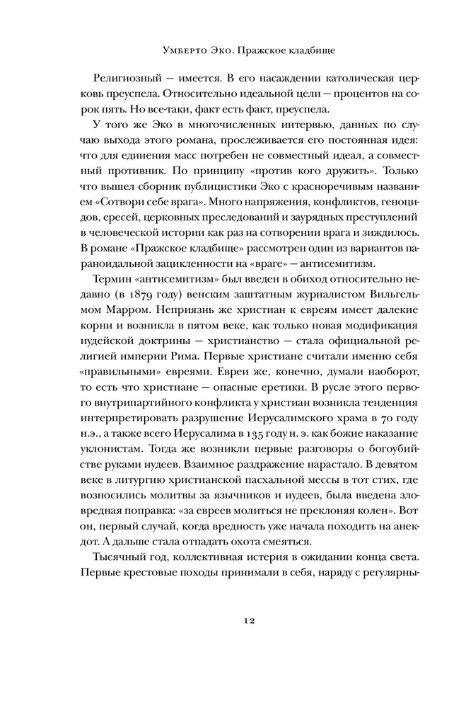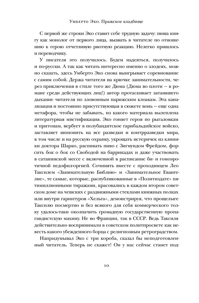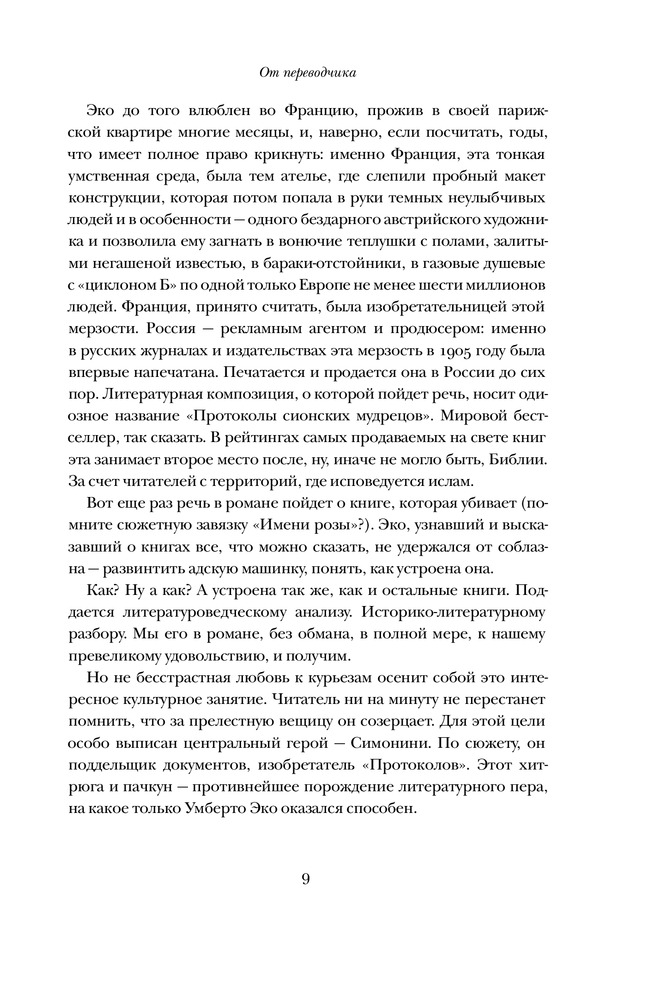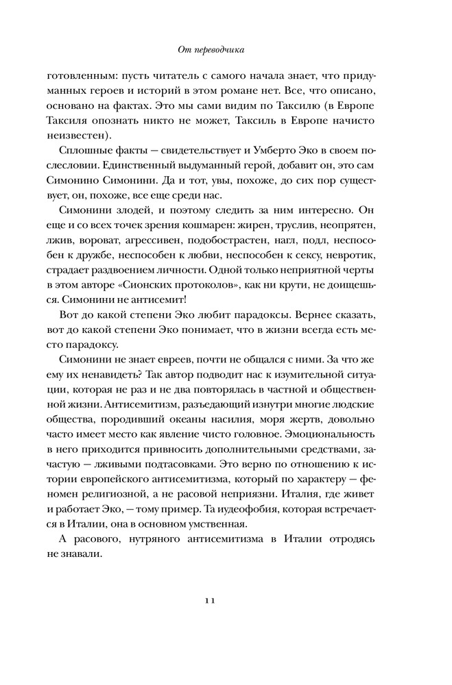 Честно говоря, "Имя розы" и "Памятник Фуко" мне нравятся гораздо больше. Однако и эту книгу, несмотря на внушительный объем, я прочла очень быстро. Позабавило наличие рецептов, которые можно опровать самому - так подробно они описаны. И самое главное - основной посыл книги о бредовости столь популярных еврейских заговоров и порабощении мира, кто как, а я разделяю точку зрения автора - все это придумали, чтобы найти столь нужно для отвлечения внимания внешнего врага. Если интересуетесь "Протоколами сионских мудрецов" и масонским порабощением мира, не вредно будет ознакомится с такой точкой зрения.