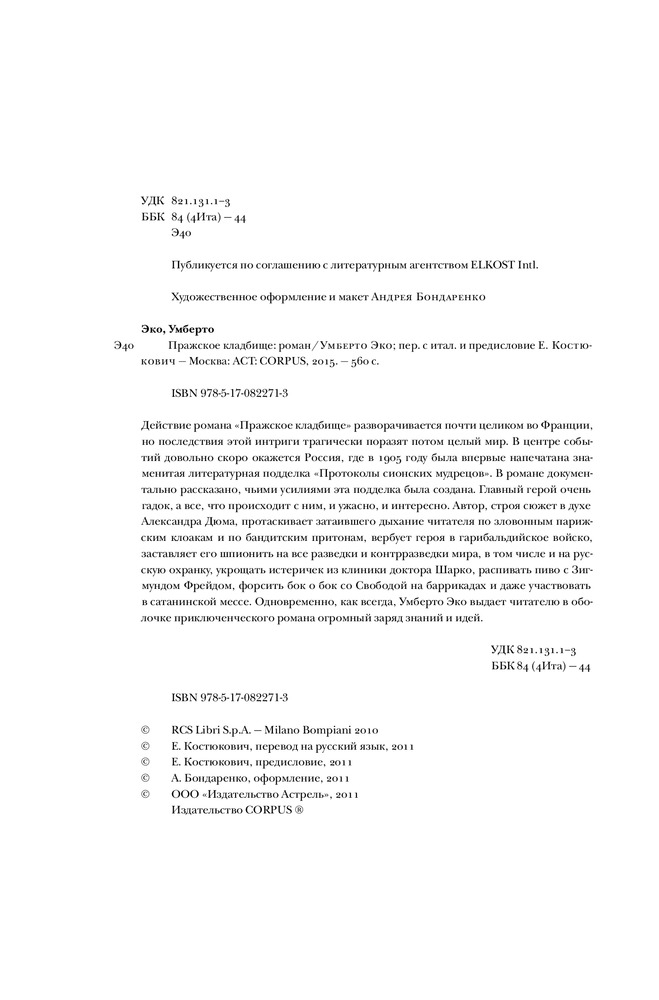 Пражское кладбищеВ данный момент этот товар отсутствует в продаже. Возможно, у нас найдется аналогичный или похожий товар здесь. Действие романа происходит в XIX веке. Ход мировой истории зависит от того, кто выиграет в тайной схватке секретных орденов и служб. Кто же стоит за всем этим? Кто этот злой гений, придумавший «Протоколы сионских мудрецов»? |