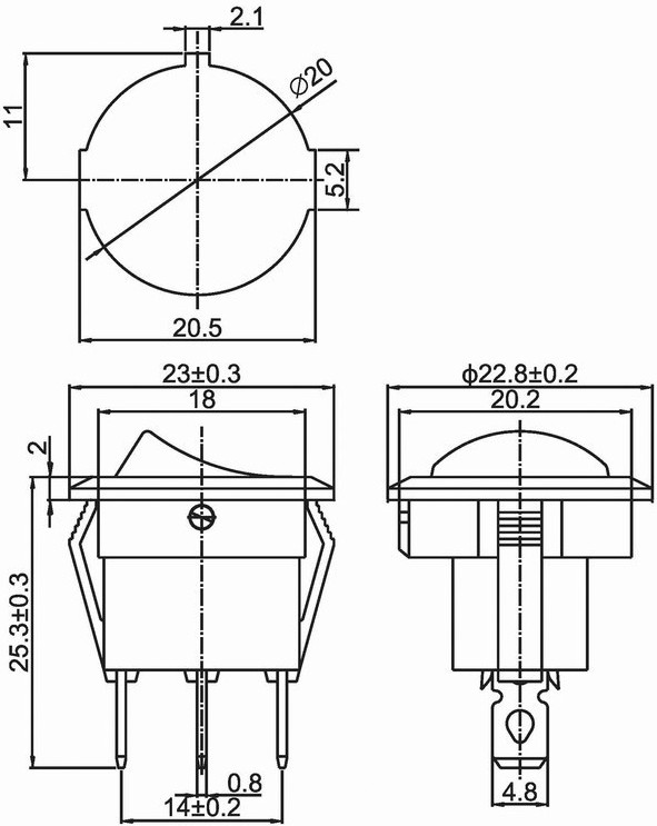 Предназначен для коммутации электрических цепей. Клавишные выключатели применяются в качестве комплектующих изделий различного электрооборудования (аудио-оборудовании, блоках питания, электроустановках на различных производствах, автомобилях, и многих других местах), с напряжением тока не более 12 В. Такой клавишный переключатель имеет два положения. Принцип действия основан на перемещении клавиши в одну из позиций. Для переключения в нужное положение требуется приложить некоторые усилия на клавишу. Монтаж осуществляется без применения винтов на плоских панелях толщиной от 0,8 мм до 3 мм. Подключение контактов осуществляется плоской клеммой, либо с помощью пайки.