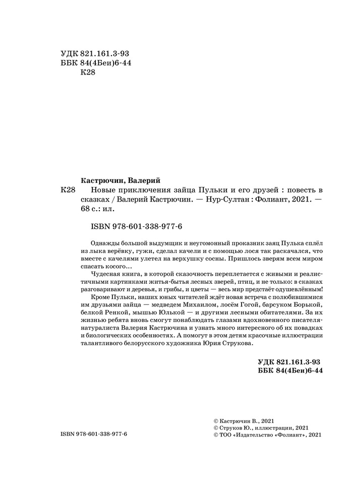 💳 Оплатить за товар можно при получении 🇰🇿 Есть бесплатная доставка по Казахстану 🎁 Копите бонусы с каждой покупки Сказочная история об удивительных приключениях зайца Пульки и его друзей, которые живут на лесной полянке. Со времени первого выхода в свет эта книга известного детского писателя Валерия Кастрючина выдержала уже несколько изданий, переведена на несколько языков и пользуется большой популярностью среди юных читателей. Главным достоинством данного издания является дополненный новыми сказками текст и уникальные иллюстрации. |