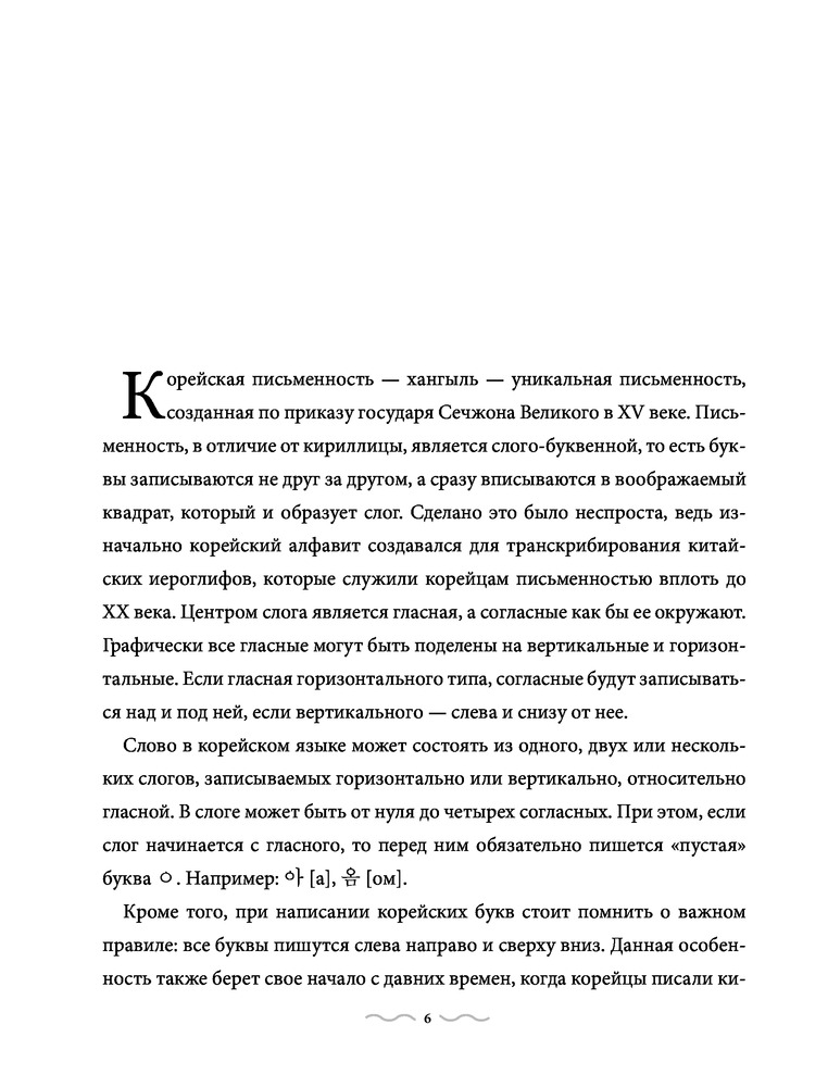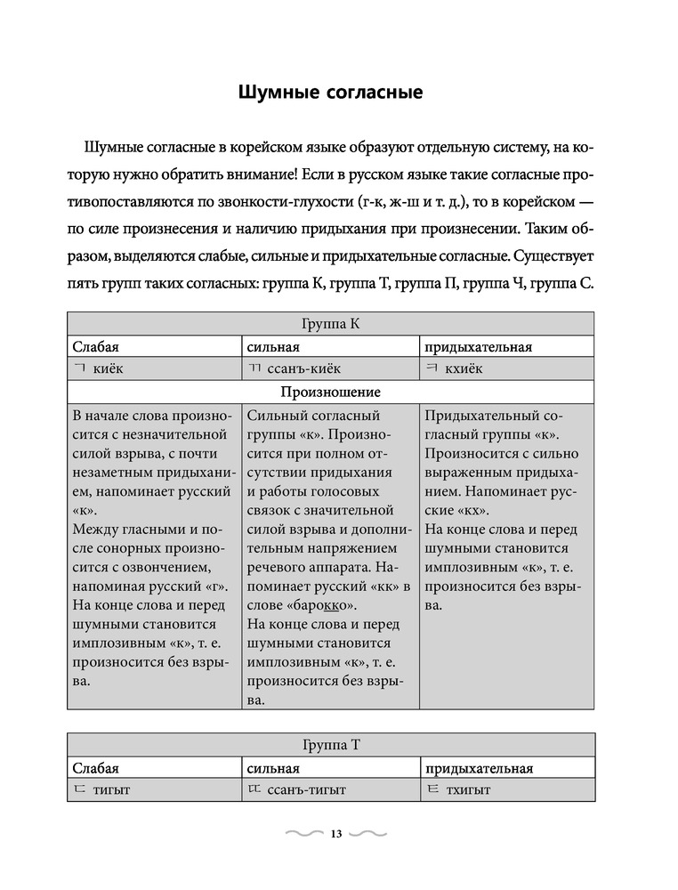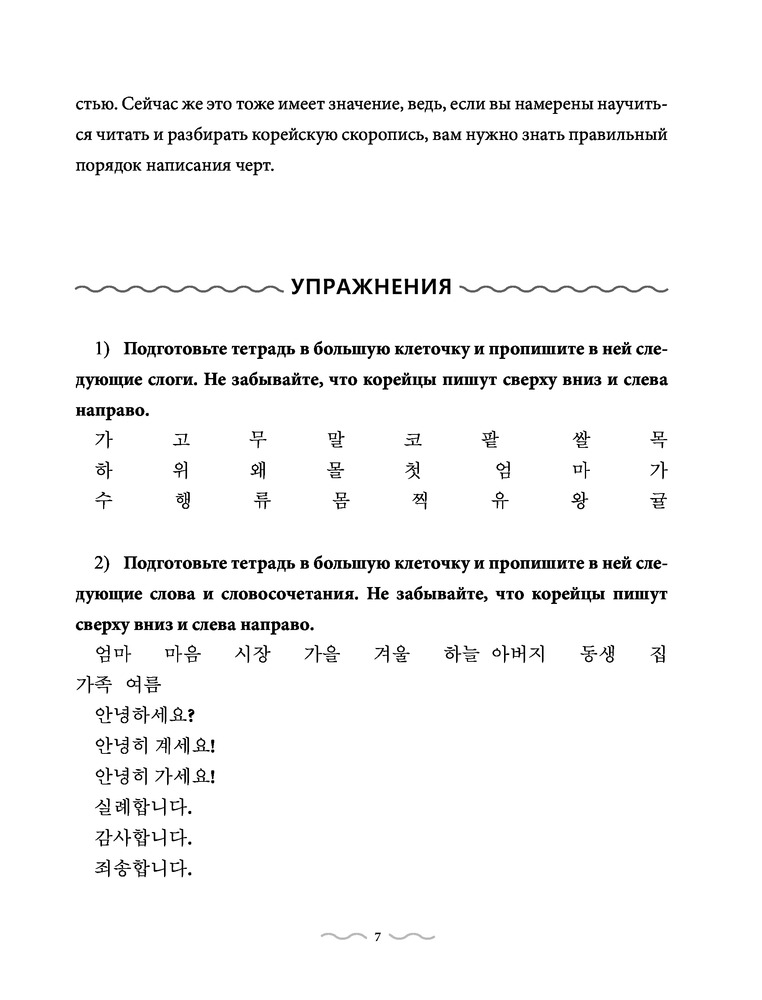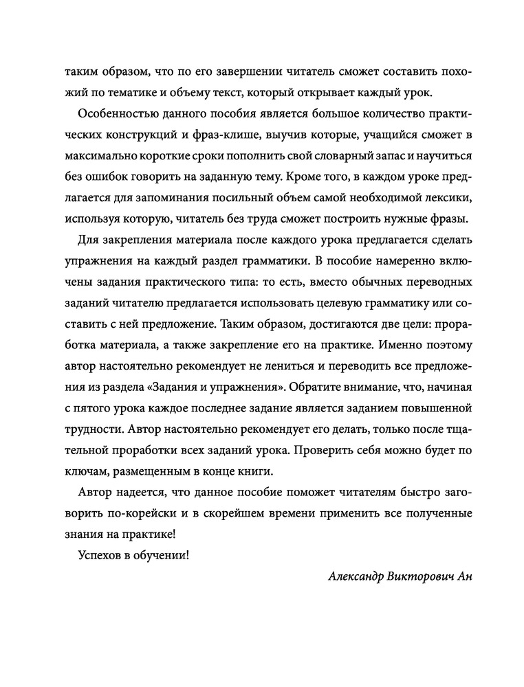 Вы начнете обучение с вводного фонетического курса — подробного разбора букв и звуков, правил чтения, а также уделите внимание правильному написанию знаков корейского алфавита. Основной курс состоит из 14 объемных уроков, каждый из которых посвящен определенной теме. В каждом уроке дается необходимый объем лексики и грамматики, а также практические упражнения на отработку и закрепление пройденного материала с ключами в конце пособия. Авторская методика нацелена на то, чтобы по завершении каждого урока учащиеся смогли говорить на заданную тему, а также читать и писать тексты среднего уровня сложности. Изучение грамматики начинается с самых простых тем и усложняется от урока к уроку. Все правила находят отражение как в текстах, так и в упражнениях. Бонусом к книге даются тексты для чтения, а также задания на закрепление пройденной лексики.