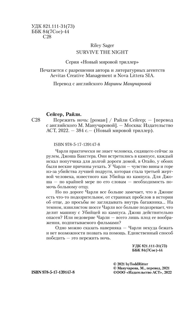"Пережить ночь" Р.Сейгер издание книги в хорошем прочном переплёте, в красивой суперобложке. Страницы не белые, шероховатые на ощупь. Содержание я бы отнесла к психологическим триллерам. Сложная, запутанная история, с совершенно неожиданными поворотами сюжета. Читается легко, сюжет увлекает. Отлично показаны взаимоотношения, и сложности в понимании: кто истинный друг, а кто таким притворяется. Отличный детектив. Впрочем, как и другие детективы Райли Сейгера. Всегда сразу же покупаю книги этого автора, только увидев фамилию - Райли Сейгер!