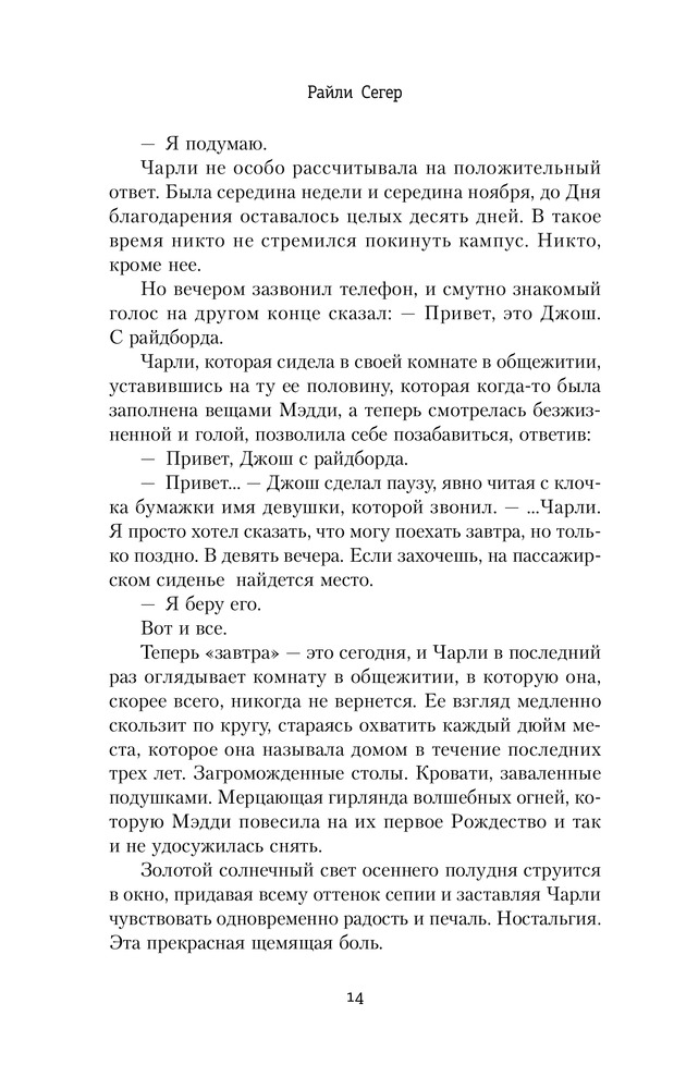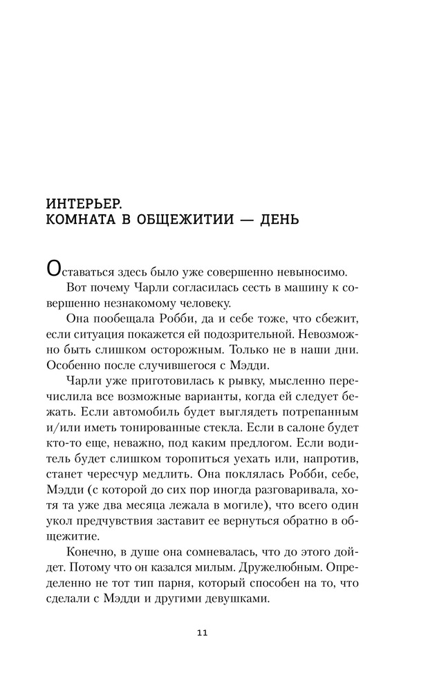 Пережить ночьВ данный момент этот товар отсутствует в продаже. Возможно, у нас найдется аналогичный или похожий товар здесь. Серия: Новый мировой триллер Чарли практически не знает человека, сидящего сейчас за рулем, Джоша Бакстера. Они встретились в кампусе, каждый искал попутчика для долгой дороги домой, в Огайо, у обоих были веские причины уехать. У Чарли — чувство вины и горе из-за убийства лучшей подруги, которая стала третьей жертвой человека, известного как Убийца из кампуса. Для Джоша — по крайней мере по его словам — необходимость помочь больному отцу.Но по дороге Чарли все больше замечает, что в Джоше есть что-то подозрительное, от странных пробелов в истории об отце, до просьбы не заглядывать внутрь багажника... На темном, извилистом шоссе Чарли все больше подозревает, что делит машину с Убийцей из кампуса. Джош действительно опасен? Или недоверие Чарли — всего лишь плод ее воображения, подпитываемого фильмами?Одно можно сказать наверняка — Чарли некуда бежать и нет возможности позвать на помощь. Единственный способ победить — это Пережить ночь. |