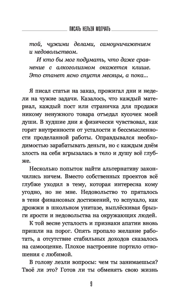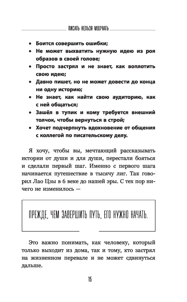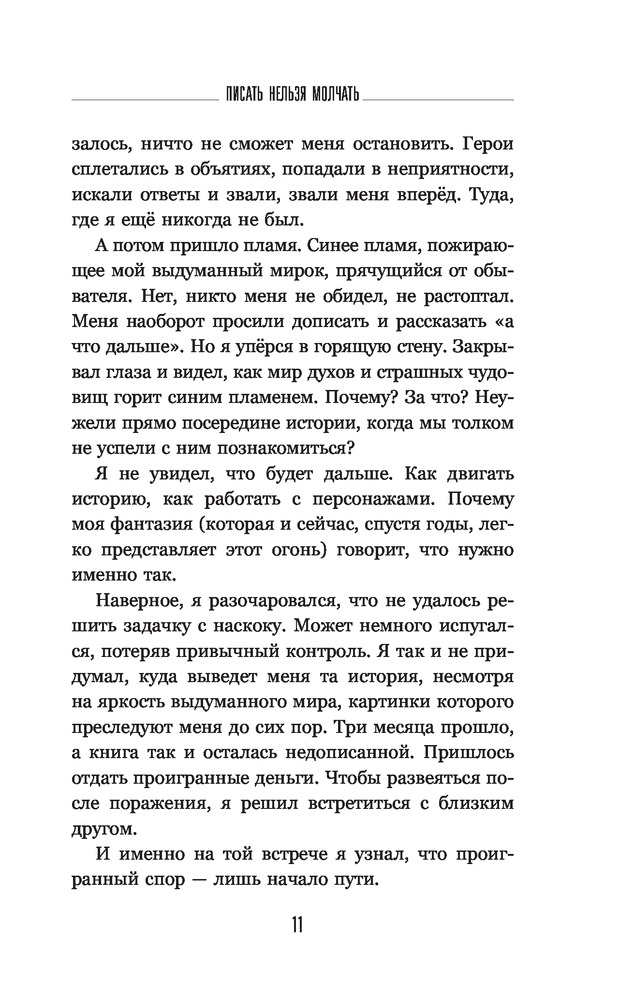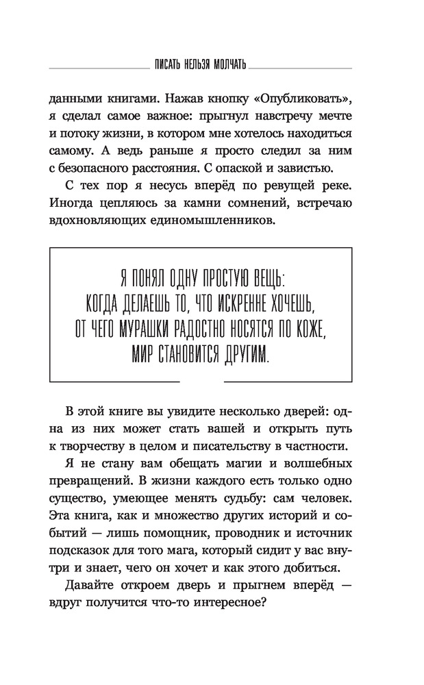 Писать нельзя молчатьВ данный момент этот товар отсутствует в продаже. Возможно, у нас найдется аналогичный или похожий товар здесь. Серия: Нонфикшн Рунета Неужели ты опять отложишь мечту — написать книгу? Опять занят и считаешь затею глупостью? А ведь чтобы сотворить историю нужно совсем немного: капелька поддержки на старте, чуток теории в процессе и безудержная энергия творчества, которую я помогу тебе разбудить. Мир живёт историями, и каждый может стать увлекательным рассказчиком. В этой книге я дам ответы на самые животрепещущие вопросы писателя-новичка. |