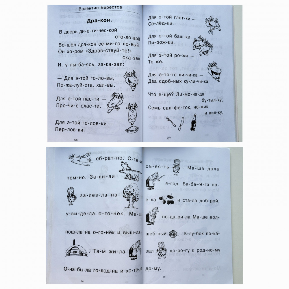 Замечательная книга, без картинок, все внимание ребенка направлено на чтение слогов. Слоги подобраны грамотно. Ребенок отложил букварь в сторону и начал читать эту книжку. Доступно для понимания и чтения ребёнком 5-6 лет. Мы по ней учились читать! Очень довольны и не пожалели об этом.